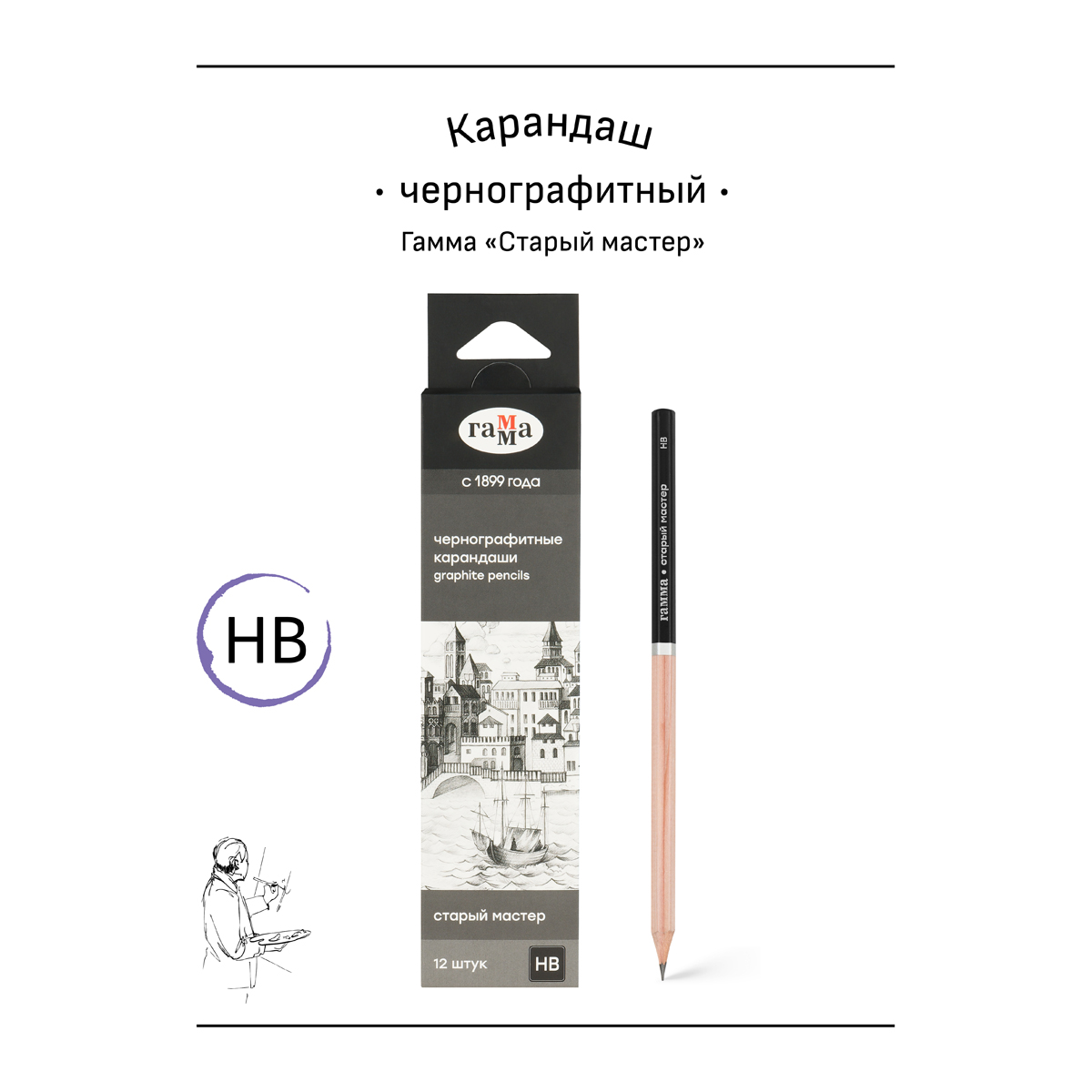 Чернографитные карандаши ГАММА серии «Старый мастер» твёрдостью HB предназначены для рисования, скетчинга и черчения на бумаге и картоне. Диаметр грифеля – 2,15 мм. Карандаши «Старый мастер» выпускаются в 20 различных степенях твердости: от 8H до 10B, поэтому идеально подойдут как для художников, иллюстраторов, так и для архитекторов и инженеров. Карандаши упакованы в картонную коробку по 12 штук.