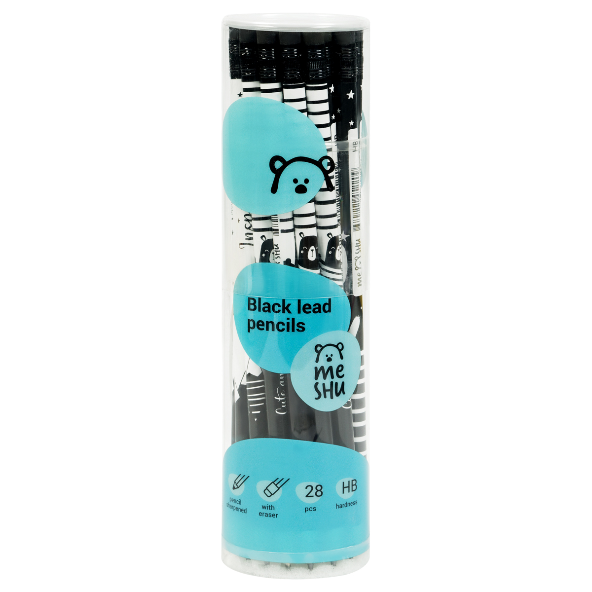 Чернографитные карандаши MESHU с печатью на корпусе и ластиком станут лучшими помощниками в школе или офисе. Карандаши представлены в круглом корпусе в четырёх разных дизайнах и упакованы в пластиковую тубу по 28 штук. Твердость грифеля – HB, диаметр – 2,2 мм, длина карандаша – 190 мм. Изготовлены из светлого дерева.<br/>Стильные яркие дизайны понравятся всем любителям милой и забавной канцелярии. Карандаши легко затачиваются и идеально подойдут для черчения и рисования. Письмо с карандашами MESHU мягкое и уверенное. Они заточены и уже готовы к работе.<br/>• Диаметр грифеля: 2,2 мм;<br/>• Твердость: HB;<br/>• Заточенный грифель: да;<br/>• Форма корпуса: круглая;<br/>• Наличие ластика: да;<br/>• Цвет дерева: светлый;<br/>• Цвет корпуса: ассорти;<br/>• Количество штук в упаковке: 28;<br/>• Тип упаковки: пластиковая туба.