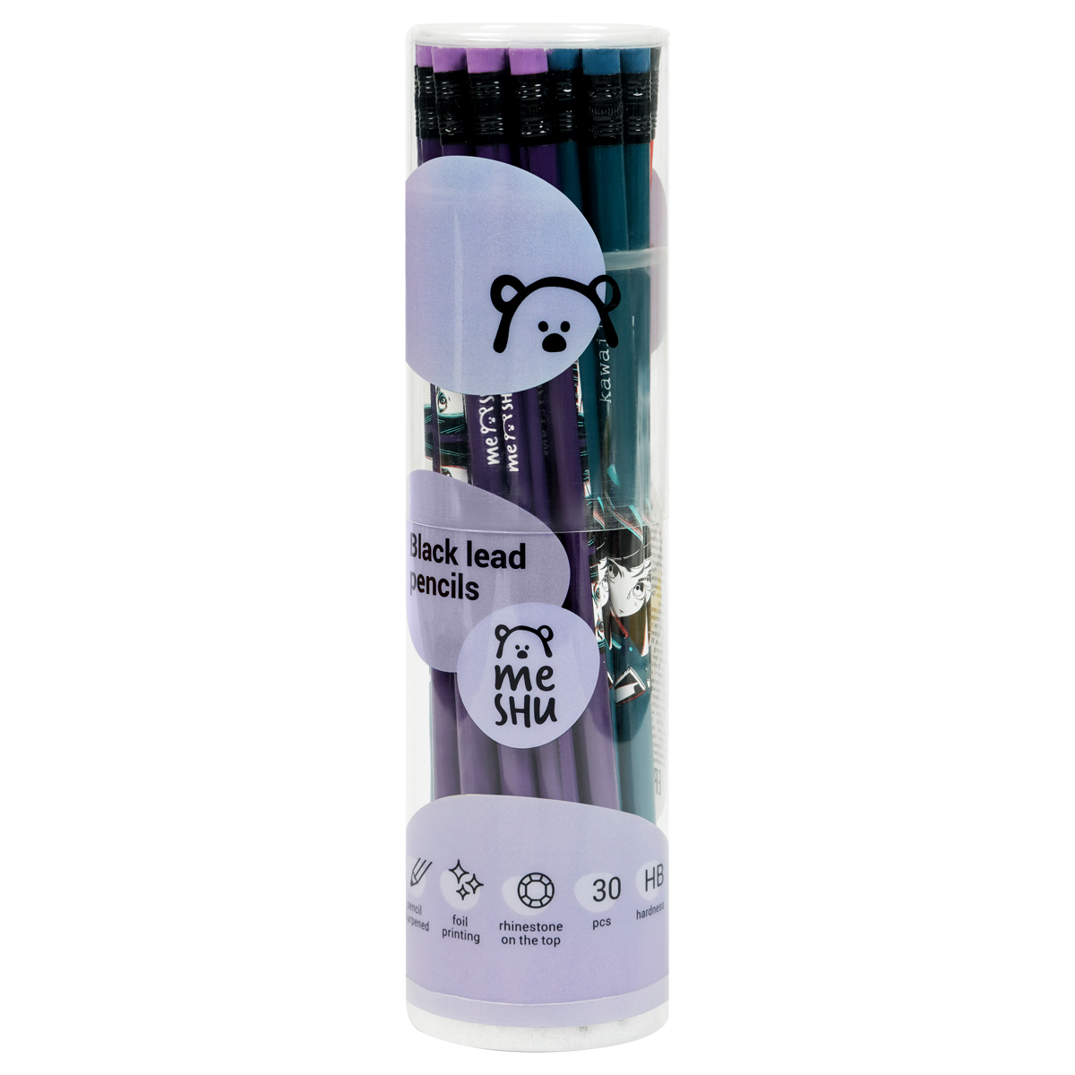 Чернографитные карандаши MESHU с печатью на корпусе и ластиком станут лучшими помощниками в школе или офисе. Карандаши представлены в круглом корпусе в четырех разных дизайнах и упакованы в пластиковую тубу по 28 штук. Твердость грифеля – HB, диаметр – 2,2 мм, длина карандаша – 190 мм. Изготовлены из светлого дерева.<br/>Стильные яркие дизайны понравятся всем любителям милой и забавной канцелярии. Карандаши легко затачиваются и идеально подойдут для черчения и рисования. Письмо с карандашами MESHU мягкое и уверенное. Они заточены и уже готовы к работе.<br/>• Диаметр грифеля: 2,2 мм;<br/>• Твердость: HB;<br/>• Заточенный грифель: да;<br/>• Форма корпуса: круглая;<br/>• Наличие ластика: да;<br/>• Цвет дерева: светлый;<br/>• Цвет корпуса: ассорти;<br/>• Количество штук в упаковке: 28;<br/>• Тип упаковки: пластиковая туба.