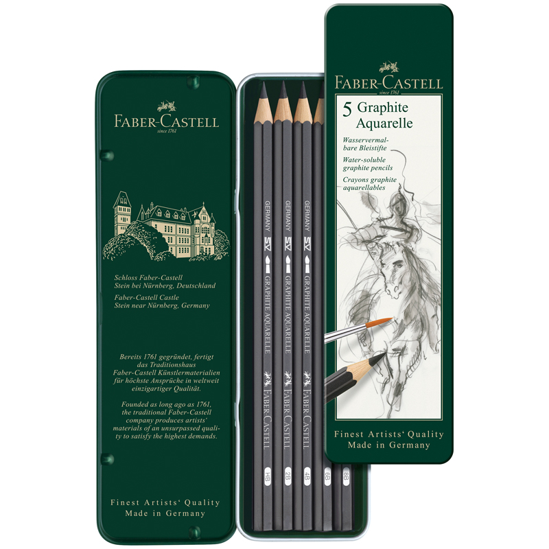 Размываемые водой чернографитные карандаши Graphite Aquarelle от легендарного немецкого производителя Faber-Castell идеально подходят для создания чернографитных акварельных рисунков и предварительных набросков при работе в акварельной технике. Благодаря специальной технологии проклеивания грифеля (SV), грифель не ломается при падении и затачивании. Набор состоит из 5 карандашей различной степени твердости: HB, 2B, 4B, 6B и 8B. Диаметр грифеля 3,3 мм.