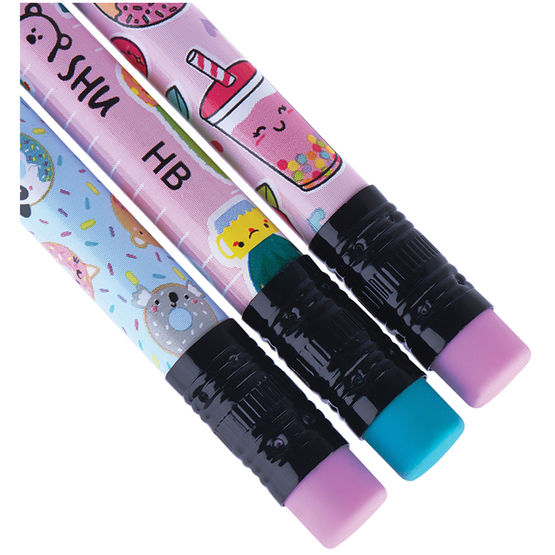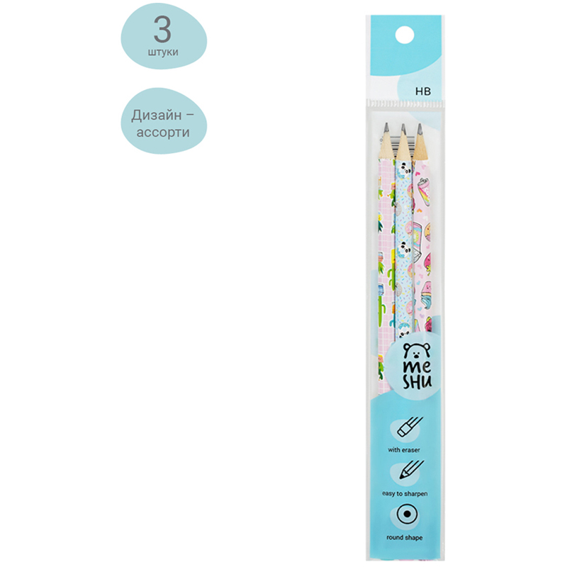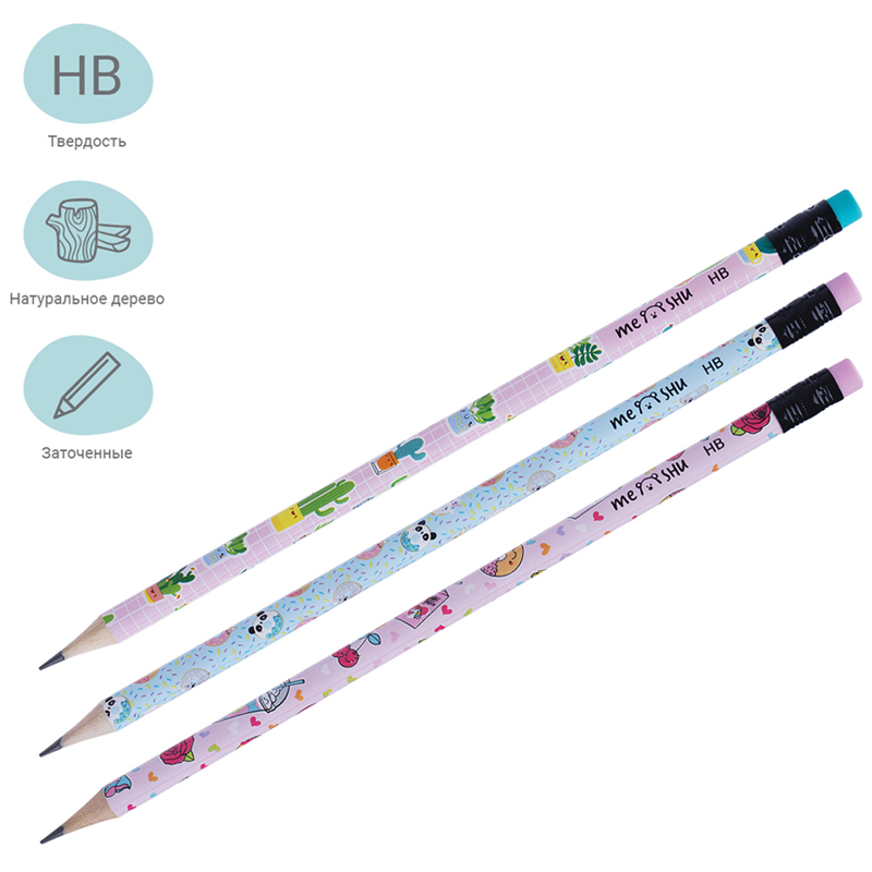 Набор чернографитных карандашей MESHU с печатью на корпусе и ластиком станет лучшим помощником в школе или офисе. Карандаши представлены в круглом корпусе в трёх разных дизайнах и упакованы в пакет с европодвесом. Твердость грифеля – HB, диаметр – 2,2 мм, длина карандаша – 190 мм. Изготовлены из светлого дерева. В наборе 3 карандаша. <br/>Стильные и нежные дизайны серии Mood Pink понравятся всем любителям милой канцелярии, которая привлекает внимание. Карандаши легко затачиваются и идеально подойдут для черчения и рисования. Письмо с карандашами MESHU мягкое и уверенное. Они заточены и уже готовы к работе. <br/>• Диаметр грифеля: 2,2 мм;<br/>• Твердость: HB;<br/>• Заточенный грифель: да;<br/>• Форма корпуса: круглая;<br/>• Наличие ластика: да;<br/>• Цвет дерева: светлый;<br/>• Цвет корпуса: ассорти;<br/>• Количество штук в упаковке: 3;<br/>• Тип упаковки: пакет с европодвесом.