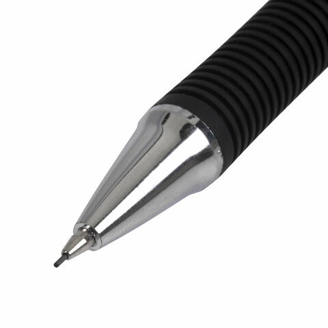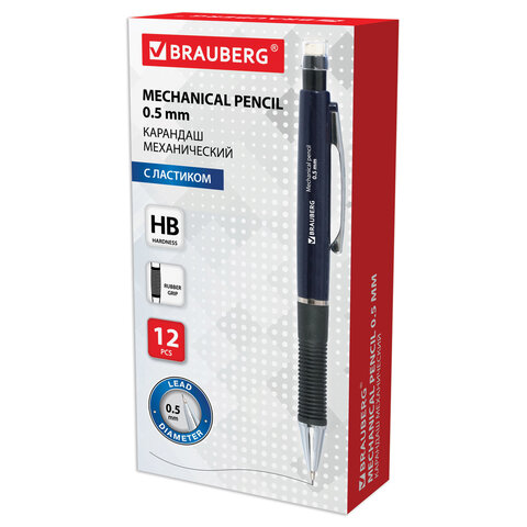 Механический карандаш BRAUBERG с корпусом синего цвета и и удобным резиновым упором, исключающим скольжение пальцев во время письма.