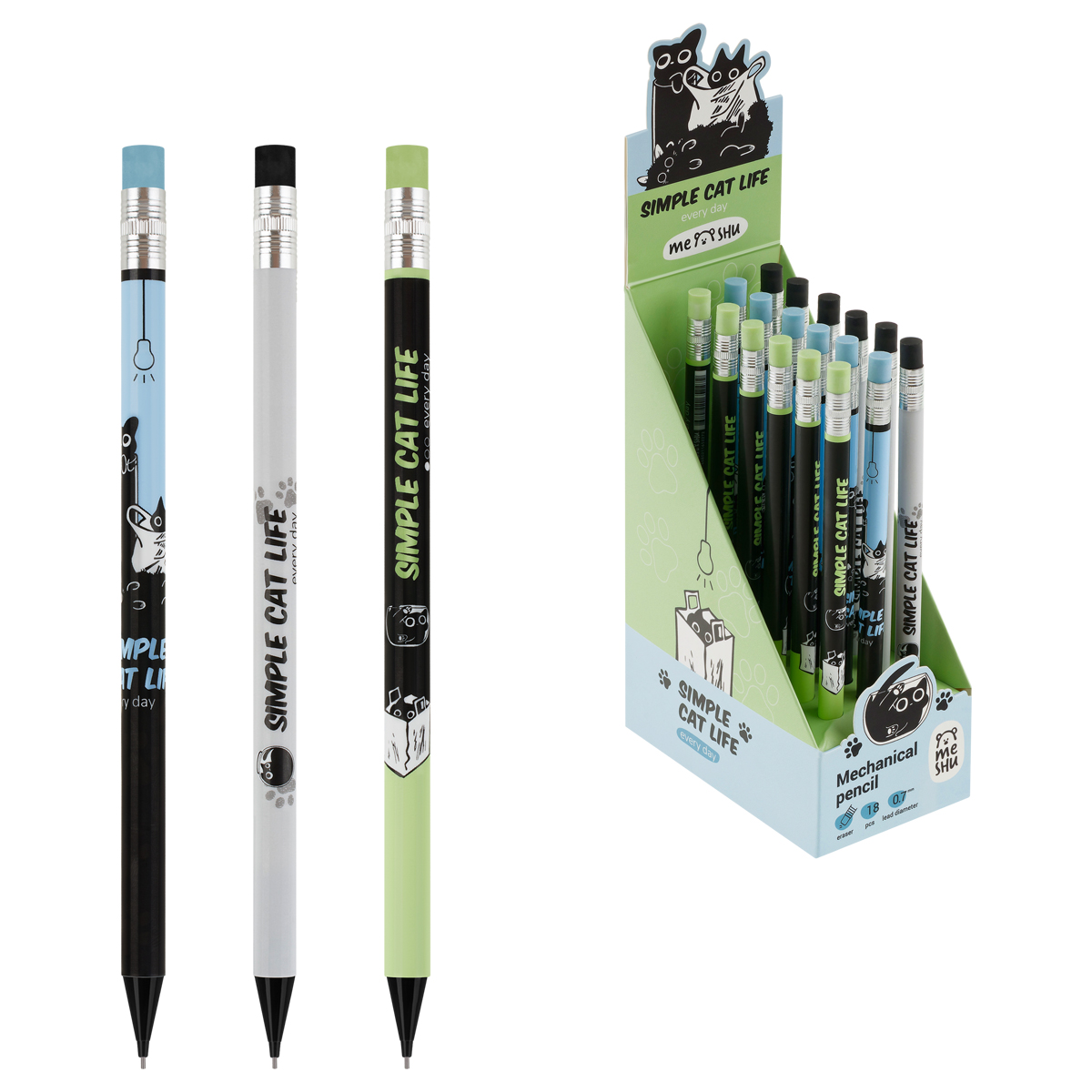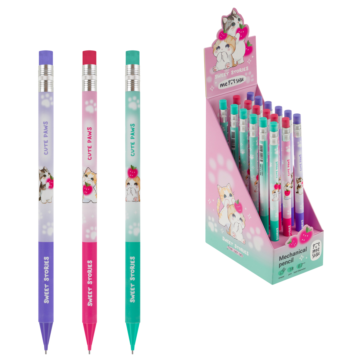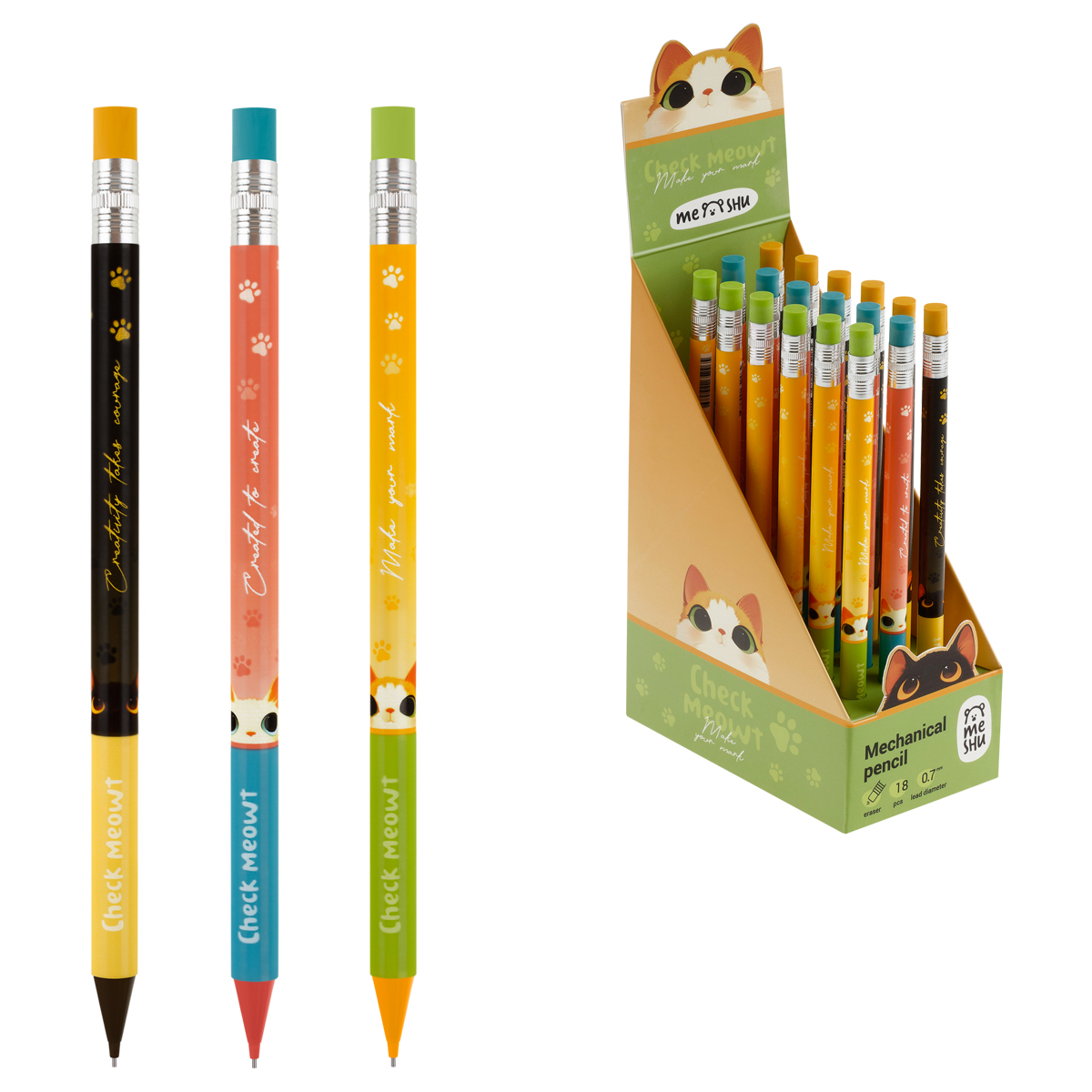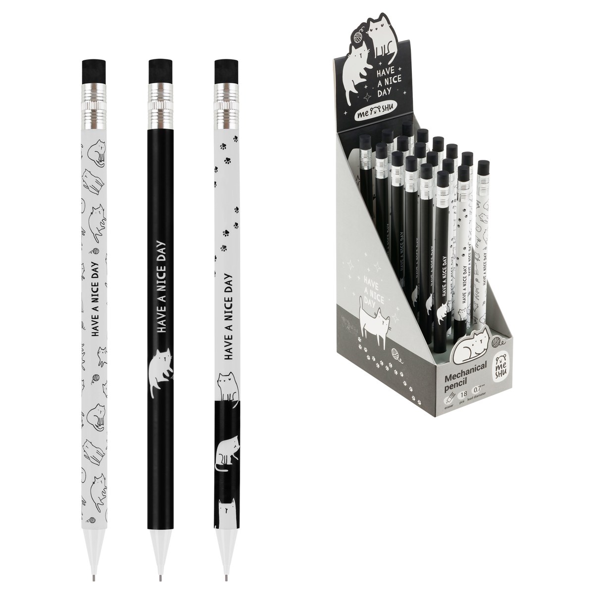 Карандаш механический MESHU "Meowsy", печать на корпусе, с ластиком, 0,7мм, ассорти