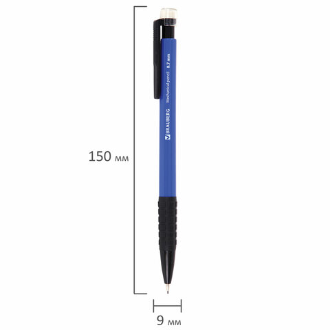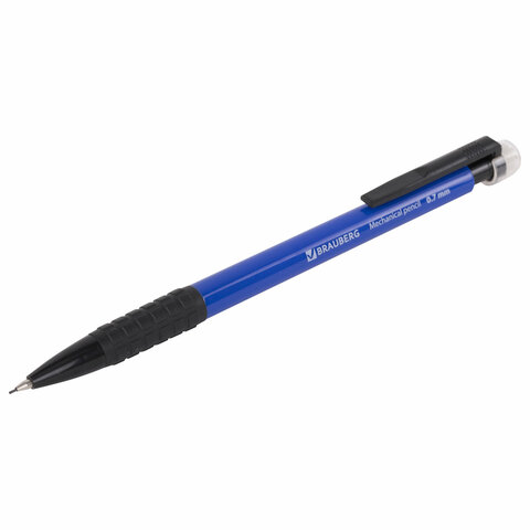 Механический карандаш BRAUBERG "Comfort" с корпусом синего цвета и удобным резиновым упором, предотвращающим скольжение пальцев при использовании.