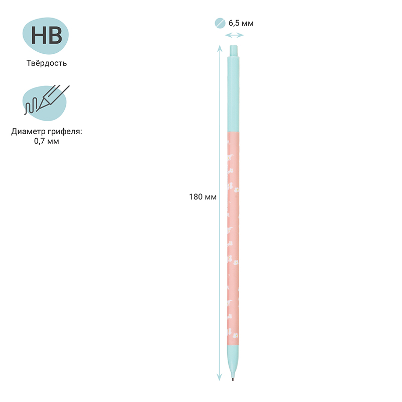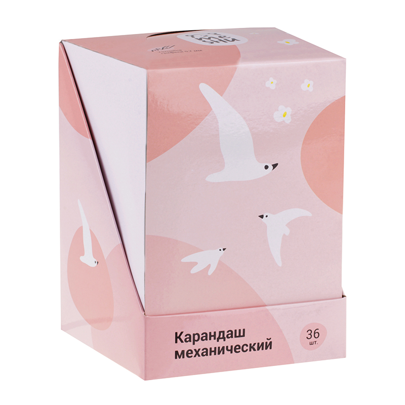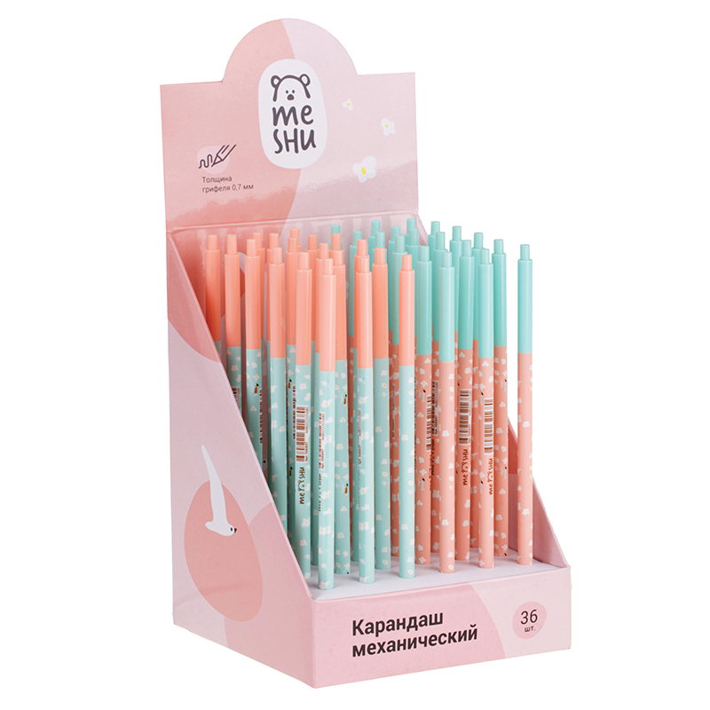 Механический карандаш с печатью на корпусе. Эргономичный, ультратонкий круглый корпус выполнен в 2 элегантных дизайнах, рисунки нанесены высококачественной термотрансферной печатью. Карандаши упакованы в эргономичный дисплей бокс по 36 штук (ассорти). Диаметр грифеля 0,7мм, твердость HB, материал корпуса - пластик, подача грифеля осуществляется с помощью кнопочного механизма.