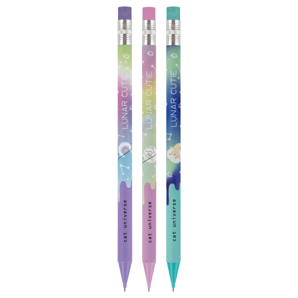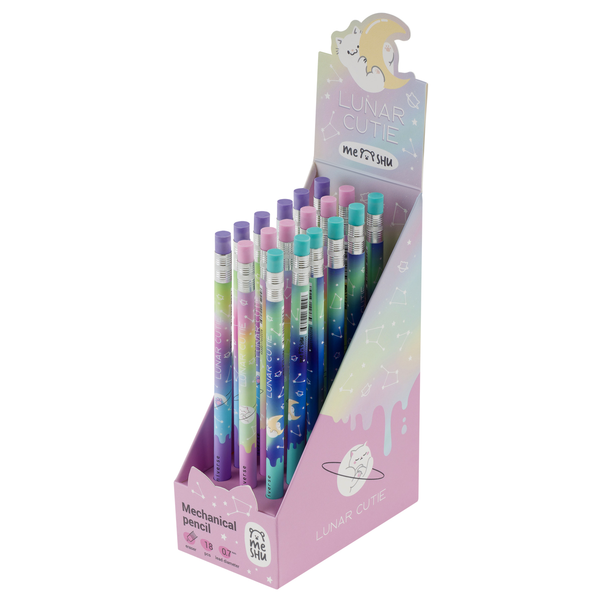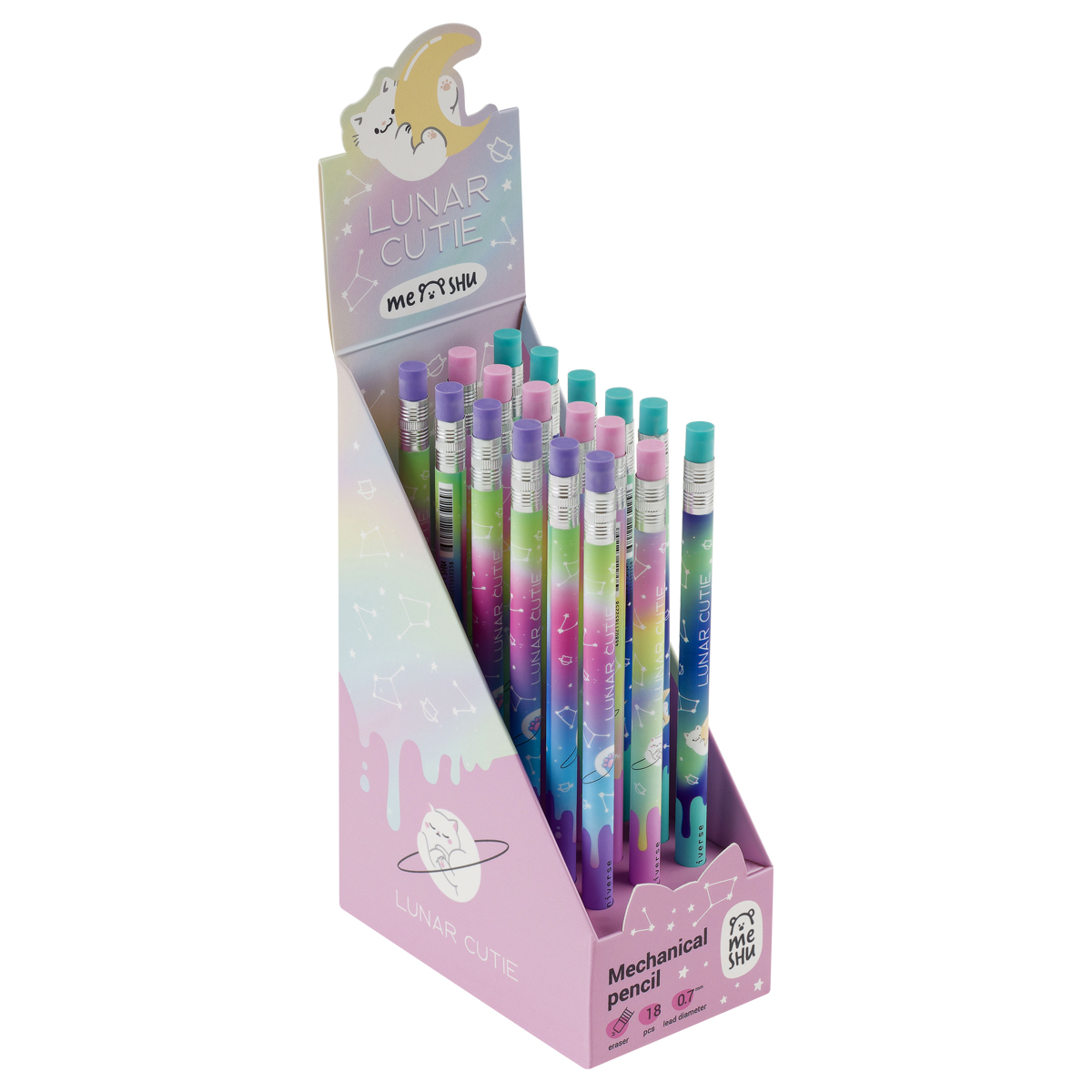 Механические карандаши с печатью на корпусе и ластиком MESHU Cat Universe станут отличными помощниками в школе или офисе. Круглый корпус выполнен в стильных, ярких дизайнах, рисунки нанесены высококачественной термотрансферной печатью. Диаметр грифеля – 0,7 мм, твердость – HB, материал корпуса – пластик. Карандаши упакованы в картонный дисплей-бокс по 18 штук. Подача грифеля осуществляется с помощью кнопочного механизма.<br/>Стильные яркие дизайны понравятся всем любителям милой и забавной канцелярии.<br/>• Твердость: HB;<br/>• Форма корпуса: круглая;<br/>• Наличие ластика: да;<br/>• Цвет корпуса: ассорти;<br/>• Количество штук в упаковке: 18;<br/>• Тип упаковки: картонный дисплей-бокс.
