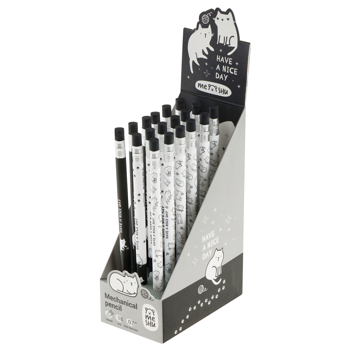 Механические карандаши с печатью на корпусе и ластиком MESHU Cute pattern станут отличными помощниками в школе или офисе. Круглый корпус выполнен в стильных, ярких дизайнах, рисунки нанесены высококачественной термотрансферной печатью. Диаметр грифеля – 0,7 мм, твердость – HB, материал корпуса – пластик. Карандаши упакованы в картонный дисплей-бокс по 18 штук. Подача грифеля осуществляется с помощью кнопочного механизма.<br/>Стильные яркие дизайны понравятся всем любителям милой и забавной канцелярии.<br/>• Твердость: HB;<br/>• Форма корпуса: круглая;<br/>• Наличие ластика: да;<br/>• Цвет корпуса: ассорти;<br/>• Количество штук в упаковке: 18;<br/>• Тип упаковки: картонный дисплей-бокс.