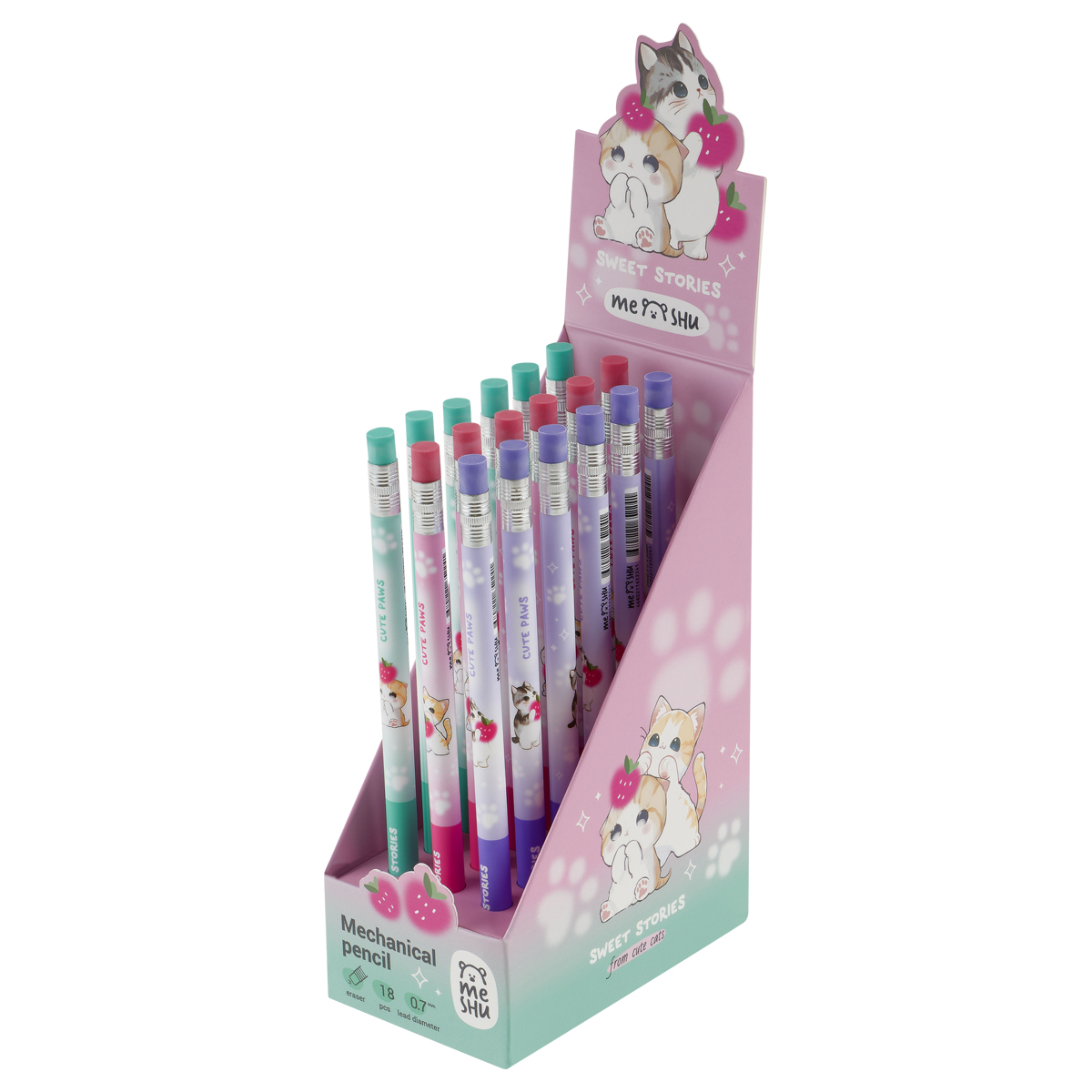 Механические карандаши с печатью на корпусе и ластиком MESHU Nice kittens станут отличными помощниками в школе или офисе. Круглый корпус выполнен в стильных, ярких дизайнах, рисунки нанесены высококачественной термотрансферной печатью. Диаметр грифеля – 0,7 мм, твердость – HB, материал корпуса – пластик. Карандаши упакованы в картонный дисплей-бокс по 18 штук. Подача грифеля осуществляется с помощью кнопочного механизма.<br/>Стильные яркие дизайны понравятся всем любителям милой и забавной канцелярии.<br/>• Твердость: HB;<br/>• Форма корпуса: круглая;<br/>• Наличие ластика: да;<br/>• Цвет корпуса: ассорти;<br/>• Количество штук в упаковке: 18;<br/>• Тип упаковки: картонный дисплей-бокс.
