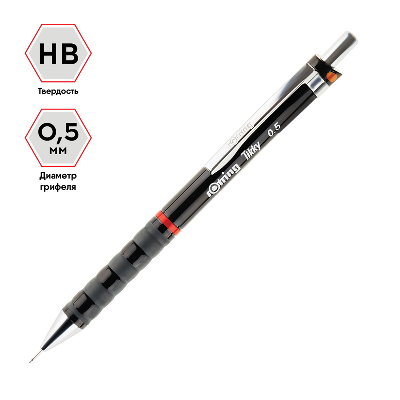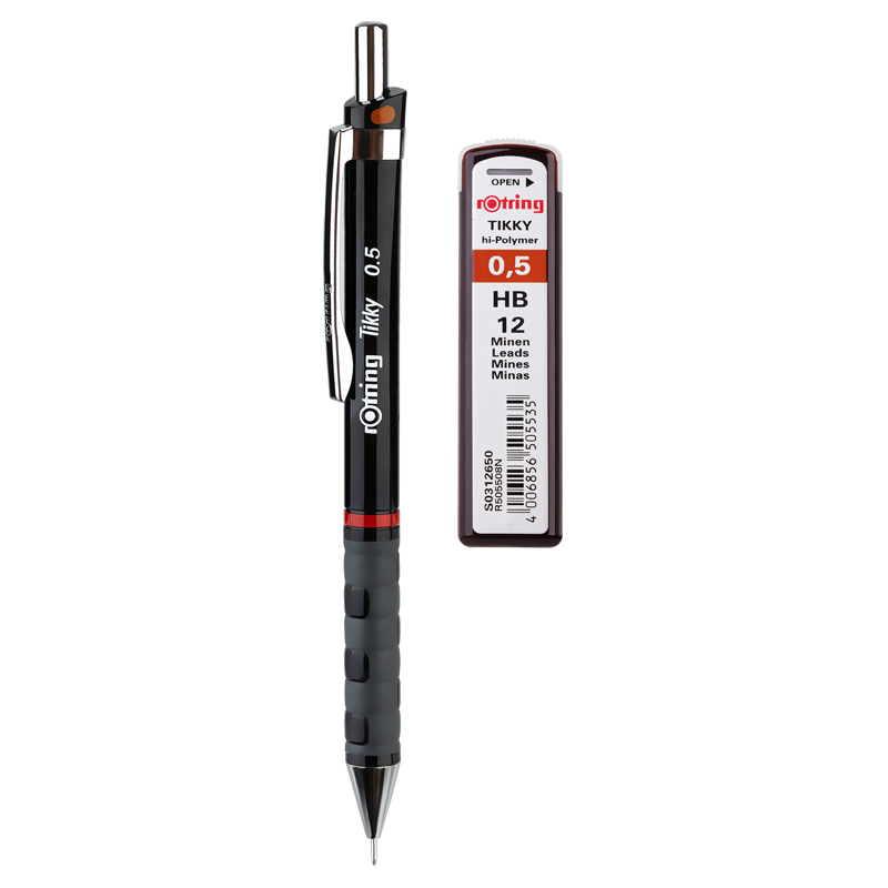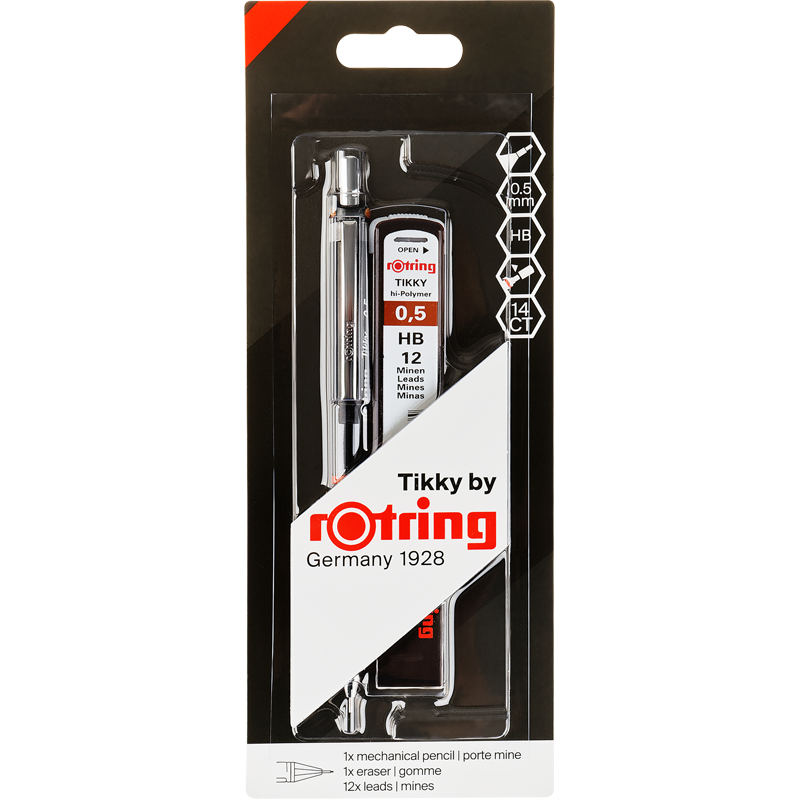 Набор Rotring Tikky. В состав набора входит механический карандаш Tikky 0,5 HB, грифели 0,5 HB и ластик. Механический карандаш Rotring Tikky обеспечивает идеальную точность письма благодаря улучшенным характеристикам. улучшенным характеристикам. Карандаш имеет эргономичную волнообразную прорезиненную зону захвата – для особого комфорта в использовании, а также встроенный ластик под колпачком кнопки.