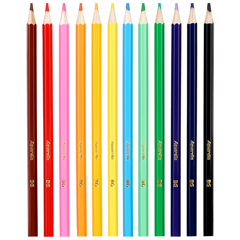 Цветные карандаши BG Aquarella шестигранной формы выполнены из высококачественных пород древесины. В набор входят 12 ярких насыщенных цветов, которые мягко ложатся на бумагу и обладают превосходной смешиваемостью. При размывании водой создается эффект акварели. Устойчив к механическим деформациям и легко затачивается. Улучшенная формула грифеля с диаметром 3 мм. Упаковка в плотную матовую картонную коробку с европодвесом. <br/>• Количество цветов: 12;<br/>• Форма корпуса: шестигранная;<br/>• Заточка грифеля: да;<br/>• Тип упаковки: картонная коробка.
