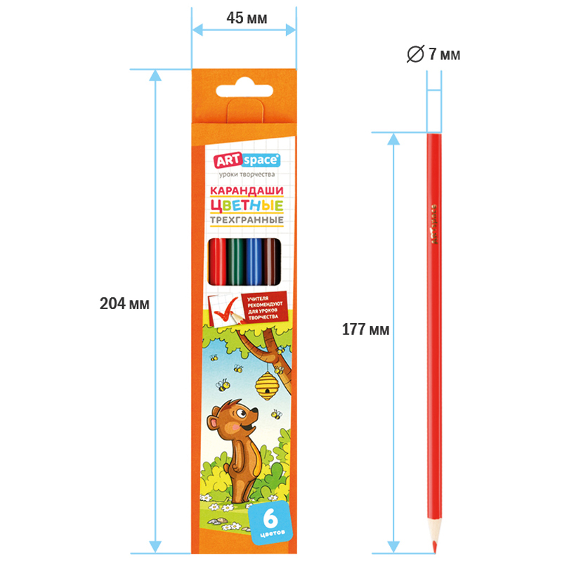 Трехгранные цветные карандаши с удобной и эргономичной формой корпуса. Карандаши легко затачиваются. Яркие цвета и мягкий грифель. Упакованы в картонную коробку с европодвесом.