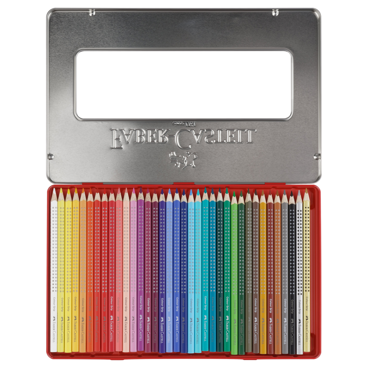 Набор цветных карандашей Grip в прочной металлической коробке от легендарного производителя Faber-Castell. <br/>Могут использоваться как простые и акварельные карандаши!<br/>Карандаши имеют узнаваемый запатентованный дизайн Grip и покрыты противоскользящими шашечками. Водорастворимый грифель карандашей состоит из высококачественных пигментов ярких оттенков. Мягкость грифеля обеспечивает легкое скольжение и комфортное рисование на бумаге любого типа. Благодаря специальной технологии проклеивания грифеля (SV), грифель не ломается при падении и затачивании.<br/>Карандаши покрыты лаком на водной основе, бережным по отношению к окружающей среде и здоровью детей. Отстирываются с большинства тканей. <br/>Карандаши Faber-Castell имеют международные сертификаты FSC и EN 71, гарантирующие экологичность и безопасность использования детьми.