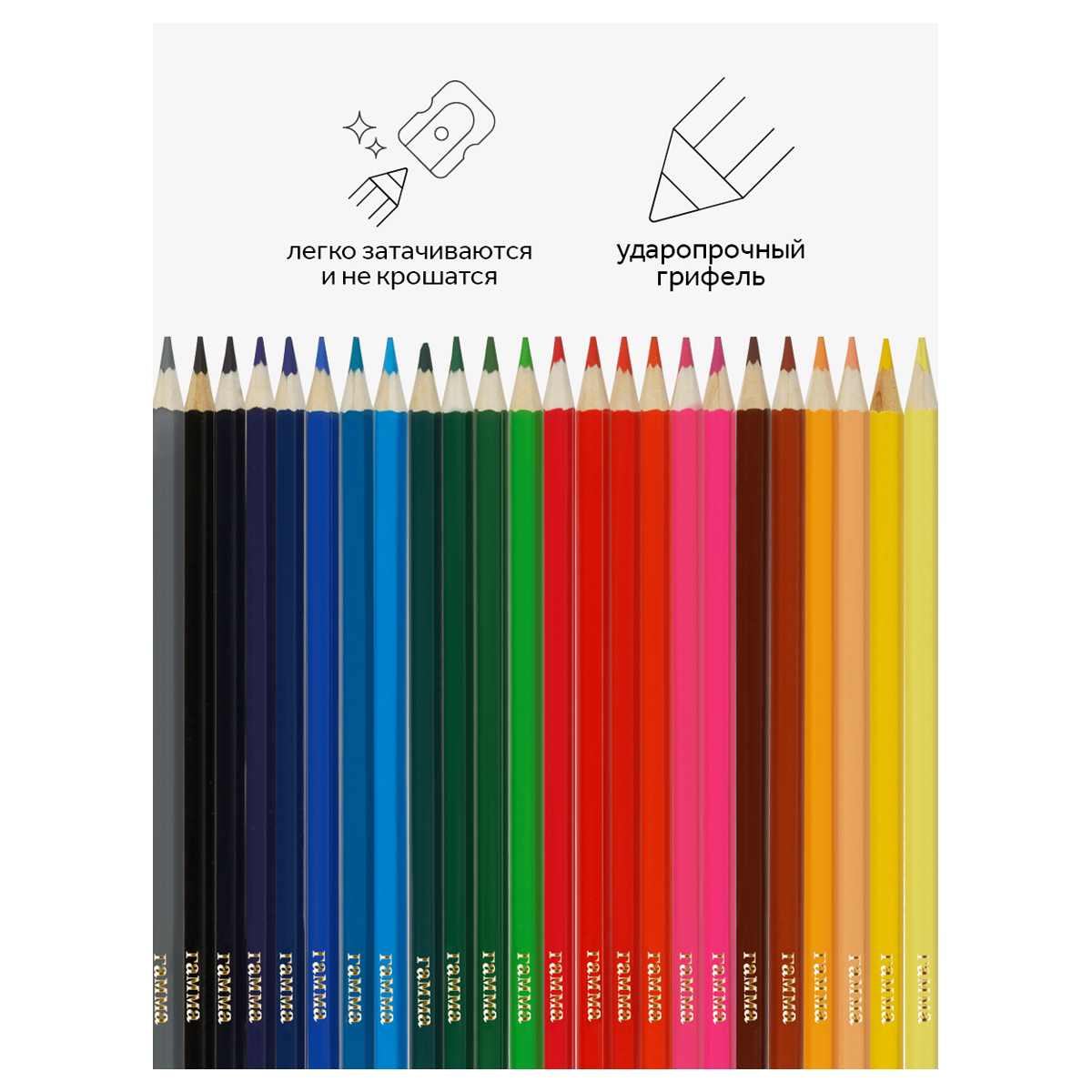 Цветные карандаши ГАММА серии «Классическая» созданы специально для детей, которые уже чувствуют себя настоящими художниками. В наборе 24 ярких и насыщеных цвета. Диаметр грифеля – 2,9 мм. Проклеенный ударопрочный грифель не крошится во время заточки и не ломается даже после падения. Корпус карандаша диаметром 7 мм и длиной 174 мм изготовлен из мягкой натуральной древесины и его легко точить. За яркость и высокую укрывистость отвечают качественные пигменты в составе. Ребенку не придется сильно давить на карандаш – рисунок получится ярким и равномерно закрашенным. Представлены в удобной упаковке-конверте в креативном дизайне. <br/>• Количество цветов: 24;<br/>• Форма корпуса: шестигранная;<br/>• Заточка грифеля: да.<br/>• Количество карандашей: 24.