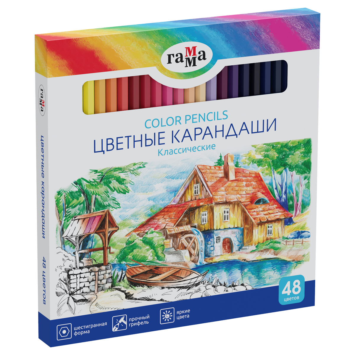 Цветные карандаши ГАММА серии «Классическая» созданы специально для детей, которые уже чувствуют себя настоящими художниками. В наборе 48 цветов – широкая палитра для безграничного творчества. Удобный шестигранный корпус из мягкой натуральной древесины легко точить. Проклеенный ударопрочный грифель не крошится во время рисования и не ломается даже после падения. За яркость и высокую укрывистость отвечают качественные пигменты в составе. Ребенку не придется сильно давить на карандаш — рисунок получится ярким и равномерно закрашенным. Карандаши обеспечивают комфортное рисование на бумаге любого типа. Представлены в удобной упаковке с креативным дизайном, вдохновляющим на творчество.<br/>• Количество цветов: 48;<br/>• Форма корпуса: шестигранная;<br/>• Длина: 175 мм;<br/>• Диаметр грифеля: 3 мм.