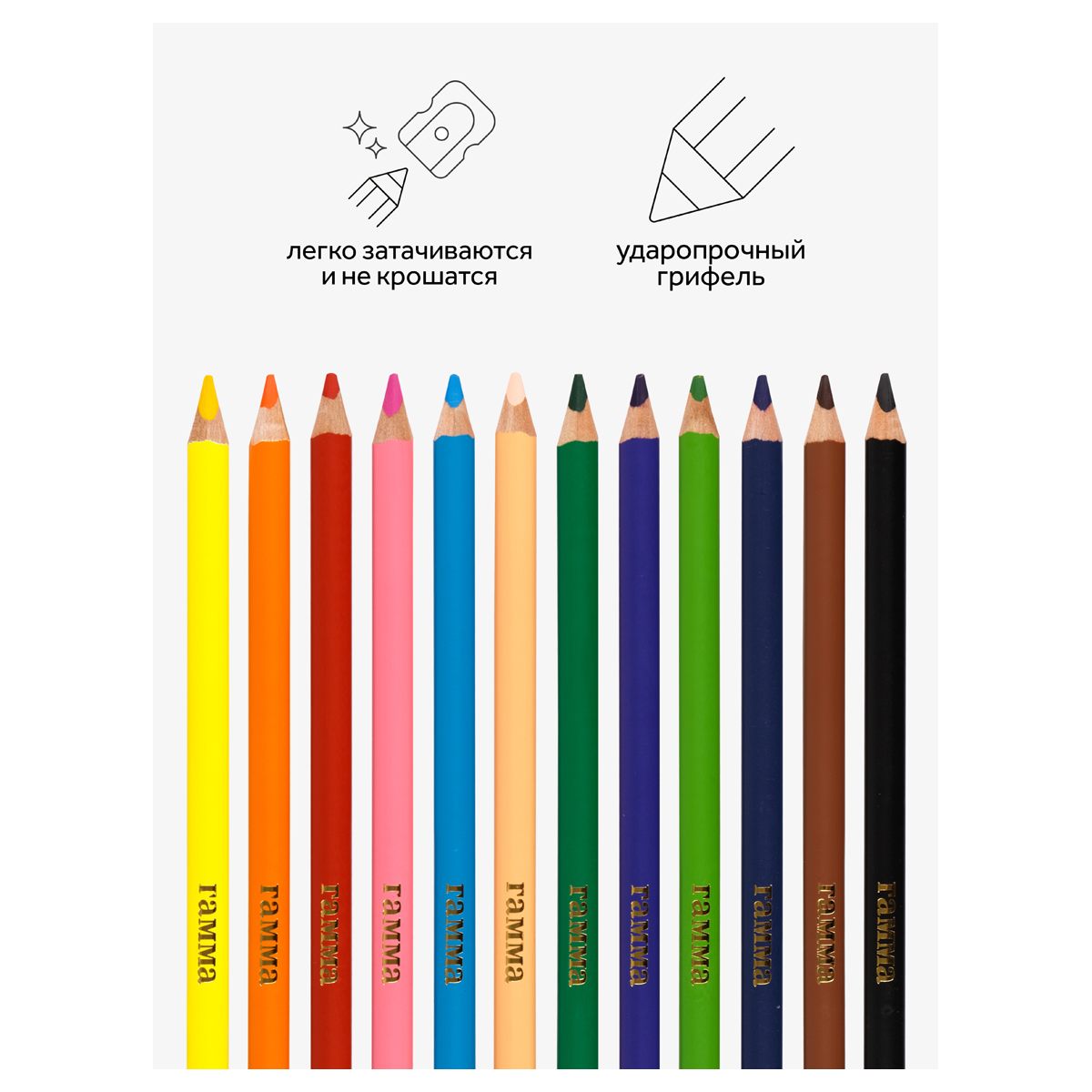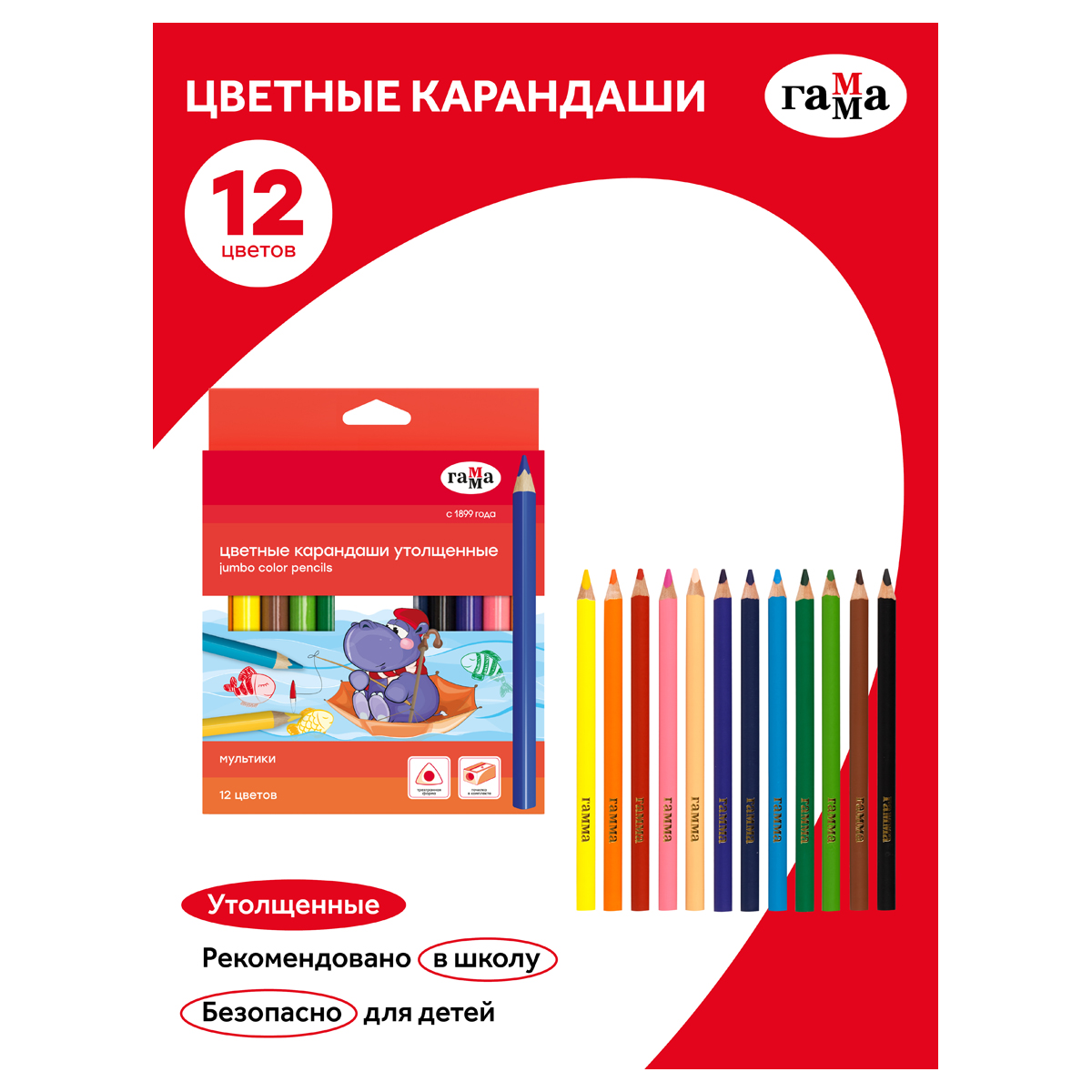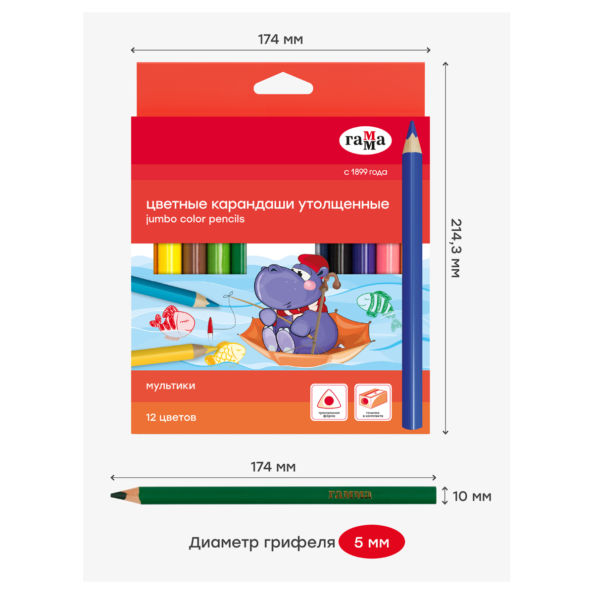 Утолщенные цветные карандаши ГАММА серии «Мультики» разработаны специально для начинающих юных художников. Карандаши выполнены в трехгранном корпусе из древесины, который удобно ложится в руку ребенка. В наборе 12 цветов: желтый, оранжевый, коричневый, телесный, черный, голубой, фиолетовый, синий, салатовый, зеленый, розовый, красный. Диаметр грифеля — 5 мм. Прочный грифель повышенной мягкости обеспечивает легкое скольжение и рисование на бумаге любого типа. Грифель не крошится во время заточки и не ломается даже после падения. Корпус карандаша диаметром 10 мм и длиной 174 мм изготовлен из дерева. За яркость и высокую укрывистость отвечают качественные пигменты в составе. Упаковка – картонная коробка с европодвесом. В комплекте есть точилка. <br/>• Количество цветов: 12;<br/>• Форма корпуса: трехгранная;<br/>• Заточка грифеля: да.<br/>• Количество карандашей: 12.