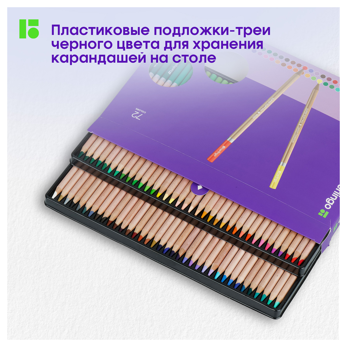 Карандаши упакованы в плотную матовую картонную коробку с покрытием soft-touch и склеенным европодвесом. Пластиковые подложки-треи черного цвета помогут хранить карандаши на столе. В подарок в каждой упаковке есть карта цветов на художественной бумаге для выкрасов и теста смешиваемости.