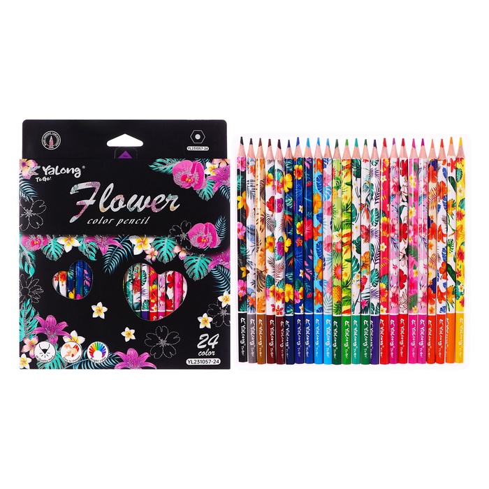 Карандаши 24 цвета в картонной коробке, шестигранные, деревянные,Цветы на чёрном МИКС