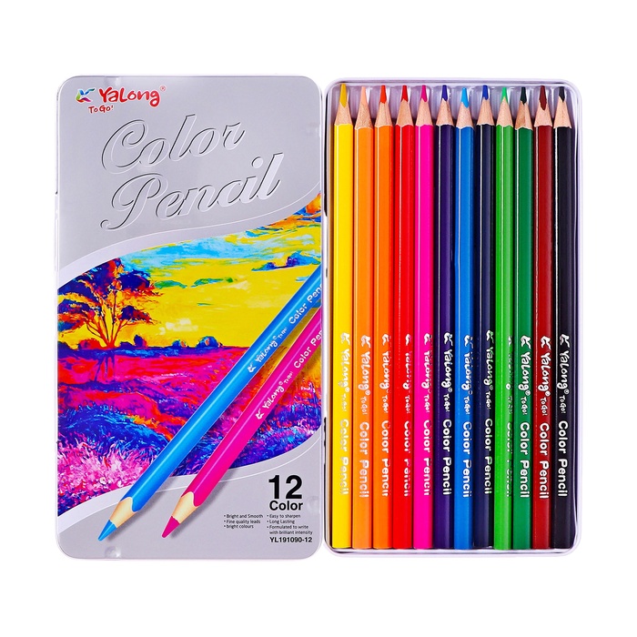 Карандаши 12 цветов, в металл пенале, треугольные, деревянные, Пейзаж,МИКС