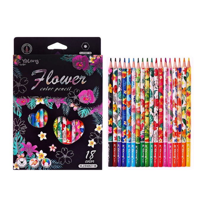 Карандаши 18 цветов в картонной коробке, шестигранные, деревянные,Цветы на чёрном МИКС