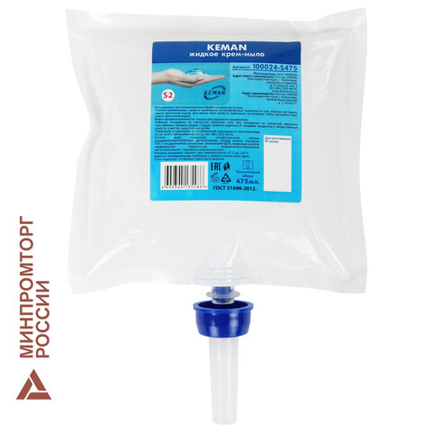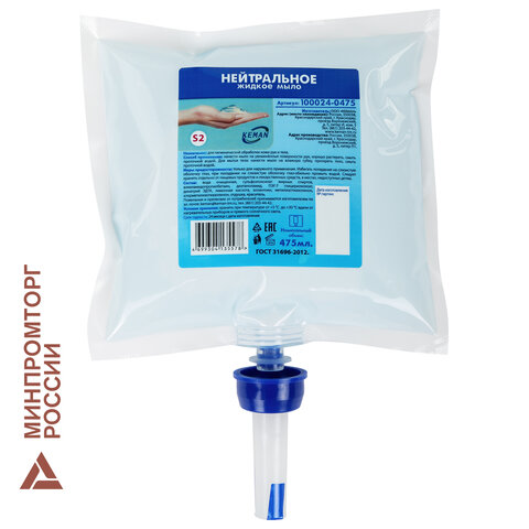 Картридж с жидким мылом одноразовый (Система S2) "Нейтральное", бесцветное, 0,475 л, KEMAN, 100024-БЦ475