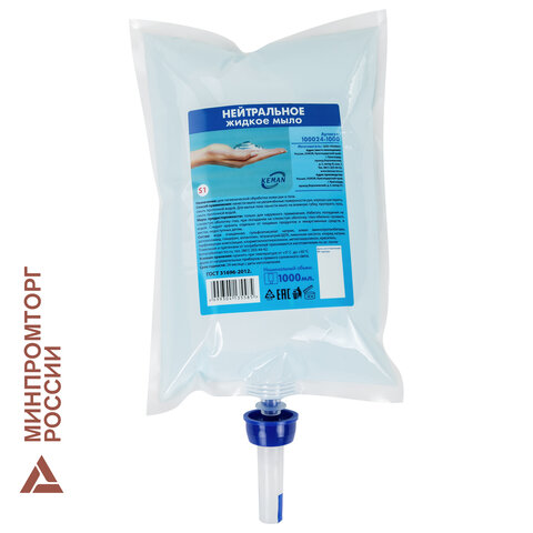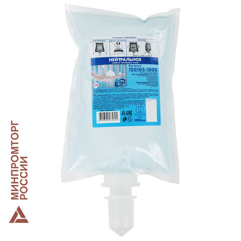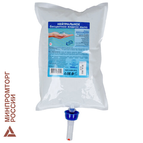 Картридж с жидким мылом одноразовый (Система S1) "Нейтральное", бесцветное, 1 л, KEMAN, 100024-БЦ1000