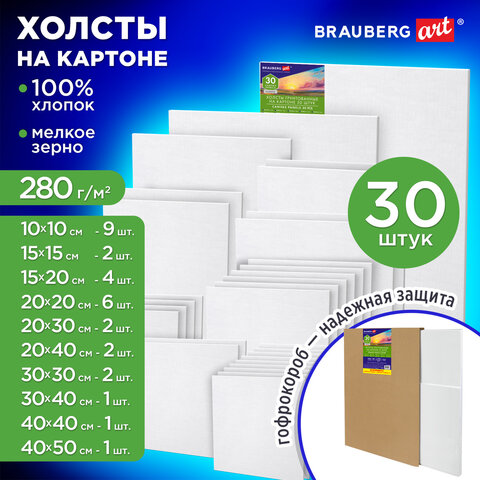 Прочная поверхность холста выдерживает множество слоев краски и воздействие разбавителей, хорошо переносит изменения влажности и температуры. Грунтованное мелкозернистое полотно из хлопка плотностью 280 г/м2 наклеено на основу из плотного картона. Холст на картоне легче и меньше по сравнению с холстами на подрамнике, тем самым он очень удобен для транспортировки. Набор из 30 холстов. Размеры: