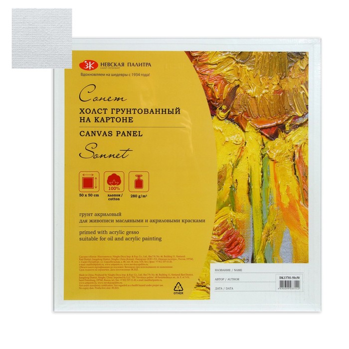 Холст на картоне хлопок 100% ЗХК "Сонет", 50 х 50 см, 3 мм, акриловый грунт, мелкое зерно