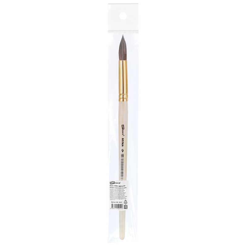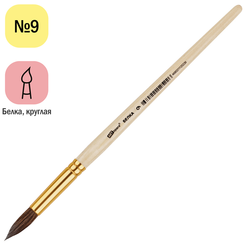 Художественные кисти ArtSpace изготовлены из натурального волоса белки. Подходят для начальных уроков рисования. Кисть круглой формы с короткой ручкой из дерева предназначены для работы с акварельными красками. Эластичный, мягкий волос прекрасно сохраняет форму пучка. Специальные технологии обработки повышают его упругость. Кисть позволяет создавать точнкие линии благодаря способности волосков плотно прилегать друг к другу во влажной среде.<br/>• Волос: белка; <br/>• Номер: 9;<br/>• Форма кисти: круглая;<br/>• Тип ручки: короткая;<br/>• Материал ручки: дерево.