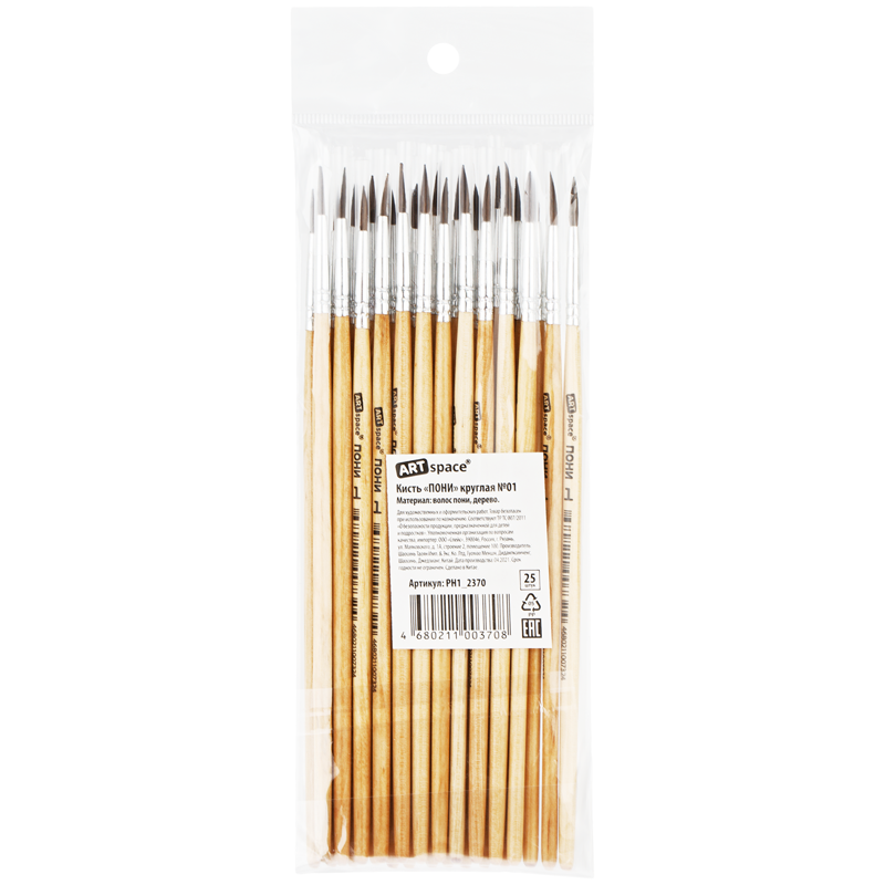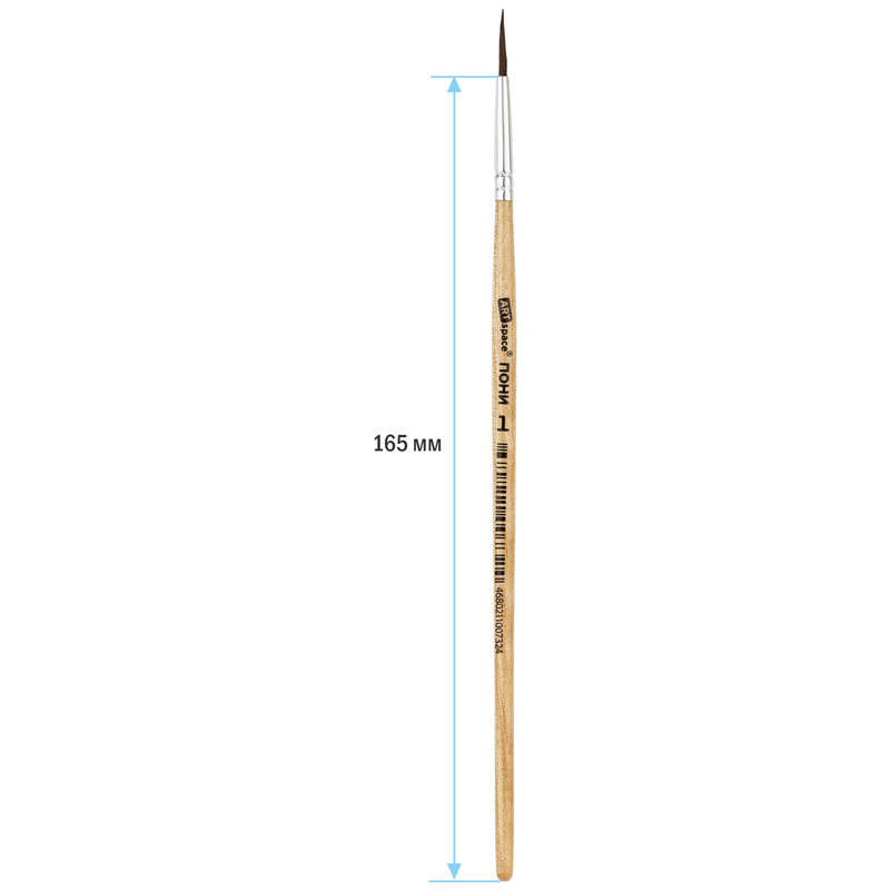 Художественные кисти ArtSpace изготовлены из волоса пони. Он несколько толще, чем у белки, расстояние между волосками больше, поэтому воду такая кисточка набирает меньше, чем из белки или колонка. Приобретают форму конуса, не слишком упруги. Кисть круглой формы с короткой ручкой из дерева идеальна для начинающих художников, поэтому её часто используют в детских образовательных учреждениях.