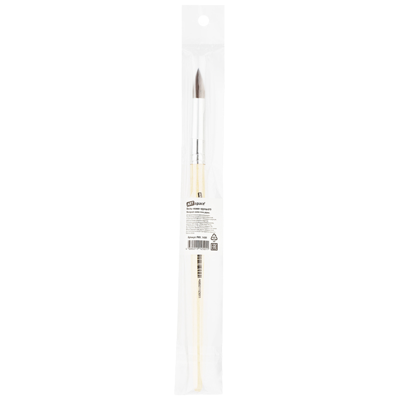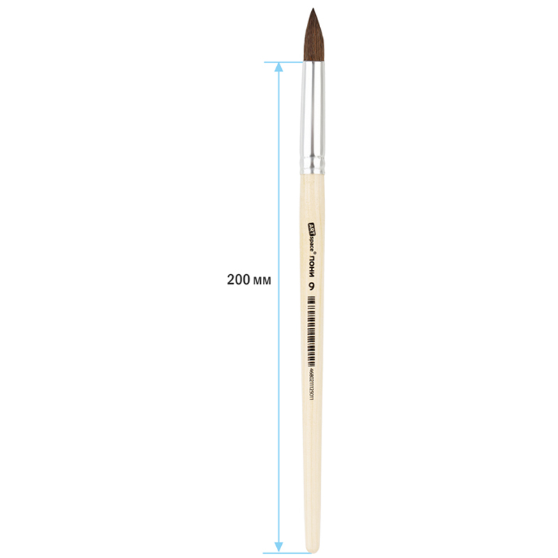Художественные кисти ArtSpace изготовлены из волоса пони. Он несколько толще, чем у белки, расстояние между волосками больше, поэтому воду такая кисточка набирает меньше, чем из белки или колонка. Приобретают форму конуса, не слишком упруги. Кисть круглой формы с короткой ручкой из дерева идеальна для начинающих художников, поэтому её часто используют в детских образовательных учреждениях.