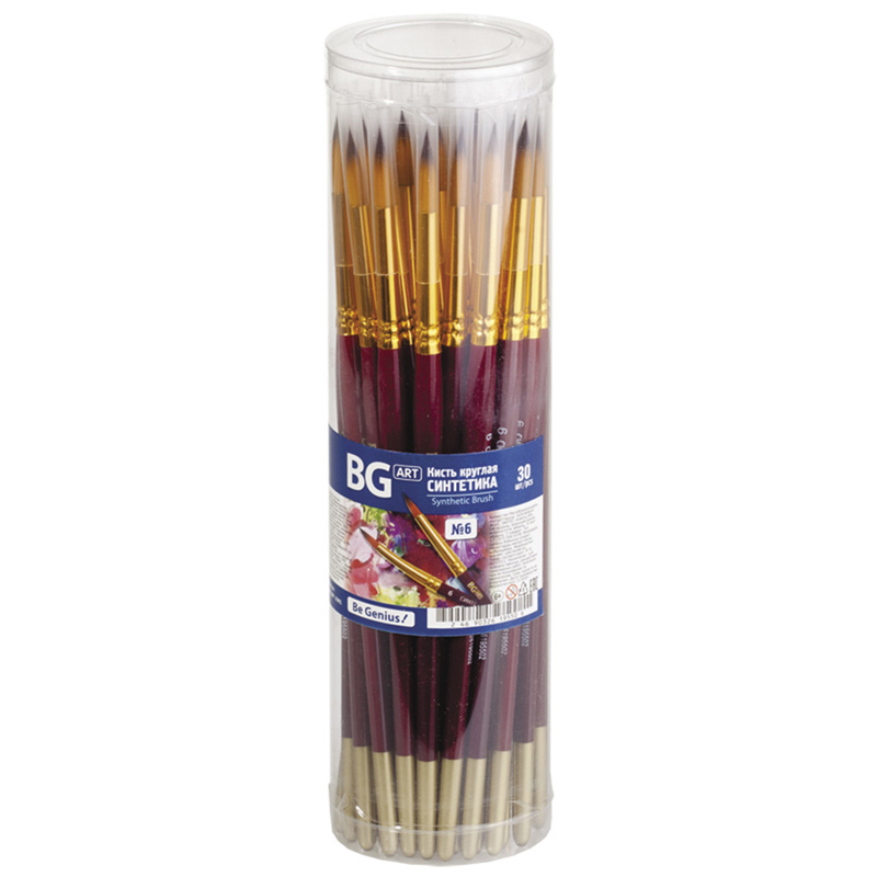 Художественные кисти BG Art изготовлены из синтетического волокна в круглой форме. Номер кисти – 6. Короткая ручка выполнена из натурального окрашенного дерева.