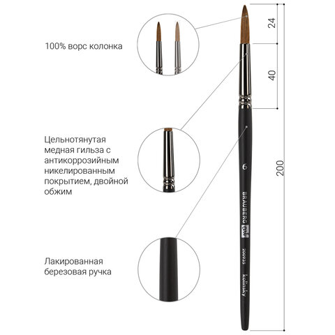 Кисти из колонка отлично впитывают и отдают краску, хорошо держат форму, долговечны и надежны. Кисть № 6 позволит комфортно прорисовывать как мелкие, так и крупные детали. Короткая ручка покрыта лаком, что защищает ее от воздействия красок и влаги. Форма пучка - круглая. Упаковка - ОПП-пакет с европодвесом и картонной подложкой.