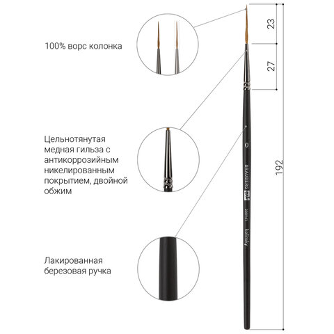 Кисти из колонка отлично впитывают и отдают краску, хорошо держат форму, долговечны и надежны. Кисть № 0 позволит комфортно прорисовывать мелкие детали. Короткая ручка покрыта лаком, что защищает ее от воздействия красок и влаги. Форма пучка - лайнер. Упаковка - ОПП-пакет с европодвесом и картонной подложкой.