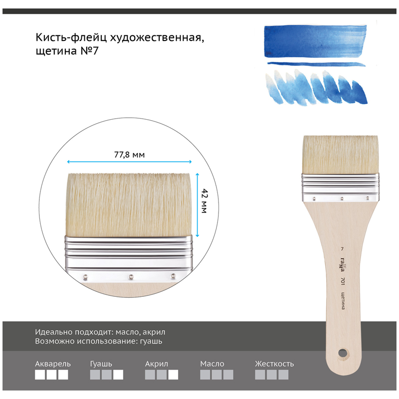 Уценка. Ограничений в дальнейшем использовании нет. Повреждения товара нет.<br/>Причина уценки: белая этикетка на единице товара<br/><br/><br/>Флейц – плоская кисть, предназначенная для нанесения широких слоёв краски одним мазком и свободной живописи заливками. Изделия универсальные, подходят для всех видов живописи и декоративных работ, способны удерживать большое количество краски; всего несколькими движениями можно создавать большие по площади фактуры. Волос, используемый в производстве флейцев, прошёл специальную обработку, исключающую выпадание волосков кисти, идеально сбалансирован в соотношении жёсткости и эластичности. Кисть имеет никелированную бесшовную обойму.<br/>• Номер: 7;<br/>• Форма кисти: плоская;<br/>• Волос: щетина;<br/>• Тип ручки: длинная;<br/>• Ширина волосяного пучка: 77,8;<br/>• Выставка: 42.<br/><br/>Уцененный товар подлежит возврату или обмену в случае обнаружения недостатков, о которых покупатель не был проинформирован перед покупкой