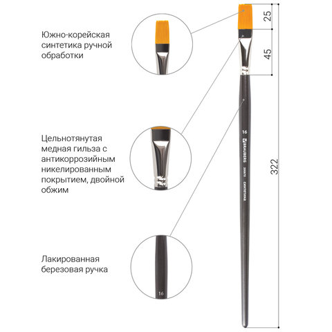 Художественная профессиональная синтетическая кисть BRAUBERG ART "CLASSIC" № 16 предназначена для работ густыми красками: гуашь, акрил, масло, темпера. Идеальна для водорастворимых масляных красок.