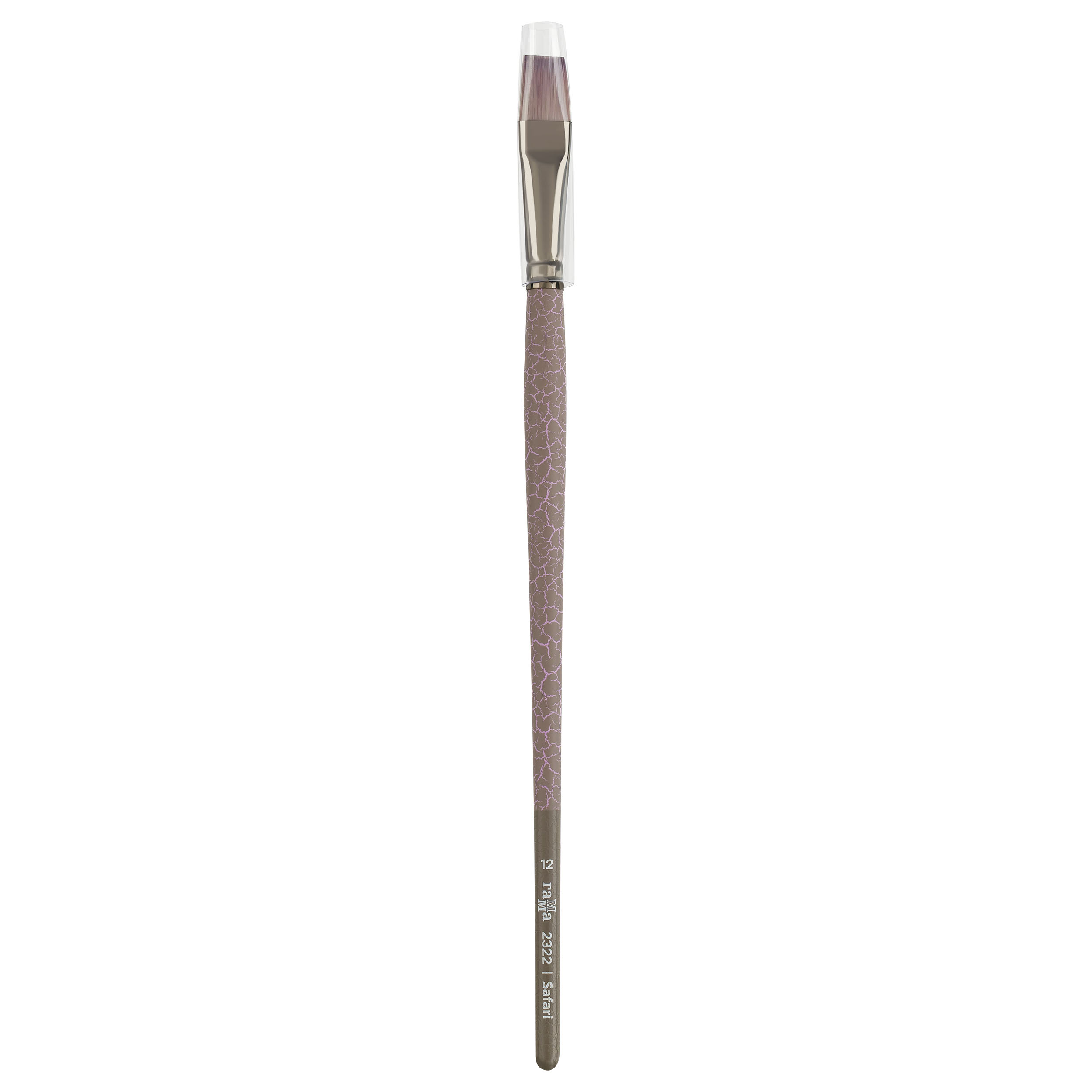 Художественные кисти ГАММА серии "Safari" изготовлены из высококачественной упругой синтетики производства Японии и предназначены для работы акварельными, гуашевыми и акриловыми красками. Тончайший синтетический волос, используемый при производстве кистей данной серии, позволяет хорошо набирать и отдавать краску, при этом отлично держит форму, обладает большой упругостью и позволяет лучше контролировать мазок. Кистью легко писать детали, выполнять заливки и моделировать объем. Бережно взаимодействует с бумагой, подходит для работы в технике лессировки. Кисть имеет цельнотянутую латунную обойму, ручку средней длины с ярким дизайном "кракелюр".<br/>• Номер: 12;<br/>• Форма кисти: плоская;<br/>• Волос: синтетика;<br/>• Тип ручки: средняя;<br/>• Ширина выставки: 12 мм;<br/>• Выставка: 16 мм.