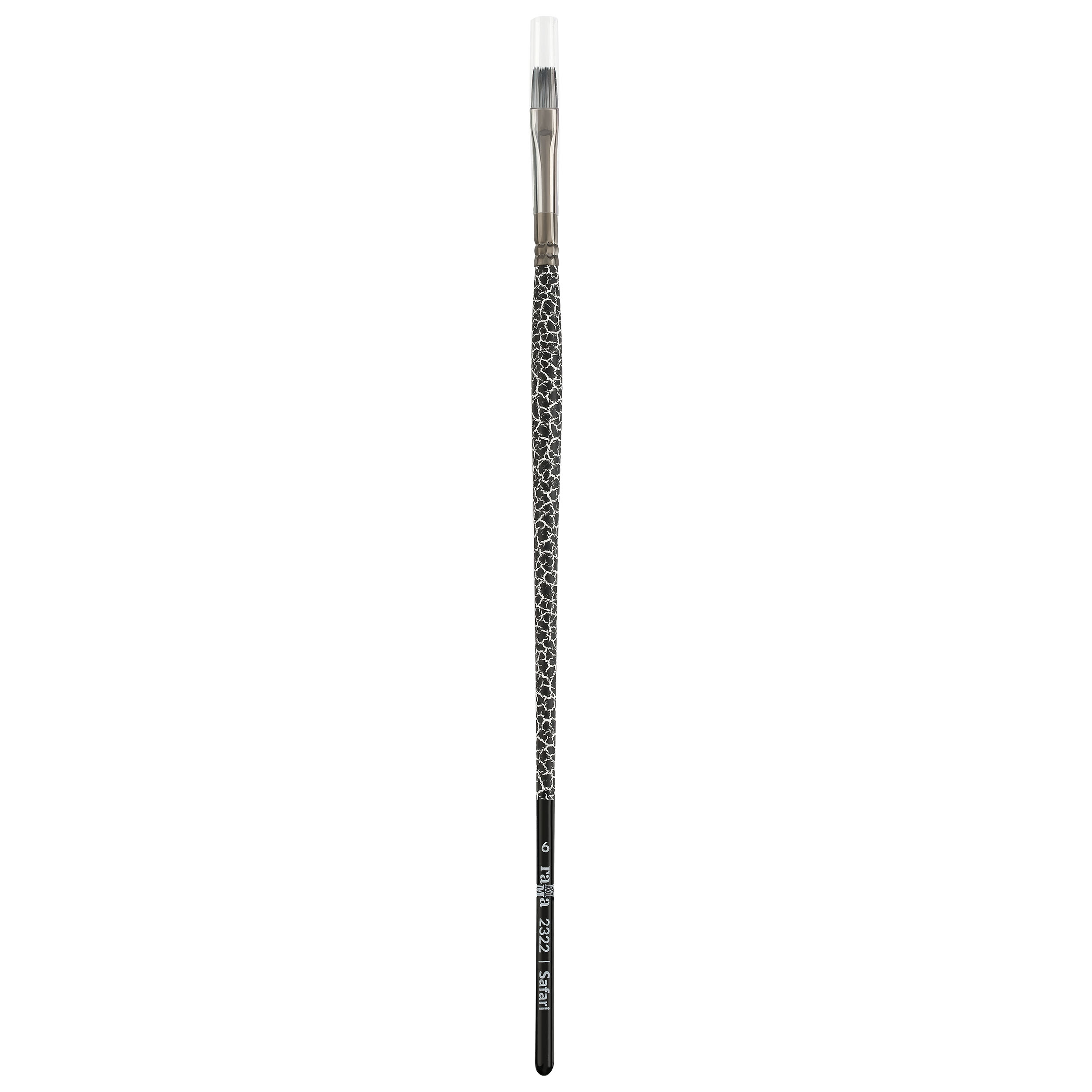 Художественные кисти ГАММА серии "Safari" изготовлены из высококачественной упругой синтетики производства Японии и предназначены для работы акварельными, гуашевыми и акриловыми красками. Тончайший синтетический волос, используемый при производстве кистей данной серии, позволяет хорошо набирать и отдавать краску, при этом отлично держит форму, обладает большой упругостью и позволяет лучше контролировать мазок. Кистью легко писать детали, выполнять заливки и моделировать объем. Бережно взаимодействует с бумагой, подходит для работы в технике лессировки. Кисть имеет цельнотянутую латунную обойму, ручку средней длины с ярким дизайном "кракелюр".<br/>• Номер: 6;<br/>• Форма кисти: плоская;<br/>• Волос: синтетика;<br/>• Тип ручки: средняя;<br/>• Ширина: 6 мм ;<br/>• Выставка: 9 мм.