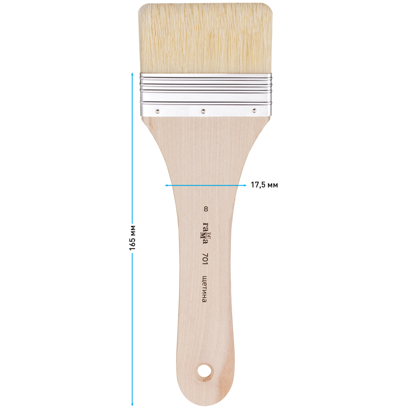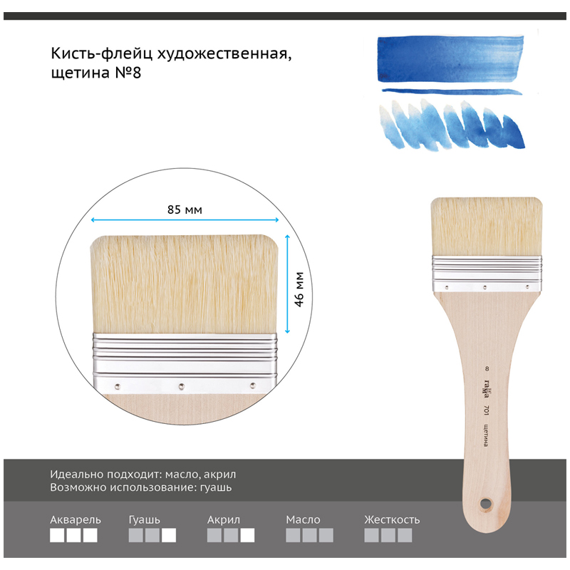 Флейц – плоская кисть, предназначенная для нанесения широких слоёв краски одним мазком и свободной живописи заливками. Изделия универсальные, подходят для всех видов живописи и декоративных работ, способны удерживать большое количество краски; всего несколькими движениями можно создавать большие по площади фактуры. Волос, используемый в производстве флейцев, прошёл специальную обработку, исключающую выпадание волосков кисти, идеально сбалансирован в соотношении жёсткости и эластичности. Кисть имеет никелированную бесшовную обойму.<br/>• Номер: 8;<br/>• Форма кисти: плоская;<br/>• Волос: щетина;<br/>• Тип ручки: длинная;<br/>• Ширина волосяного пучка: 85;<br/>• Выставка: 46.