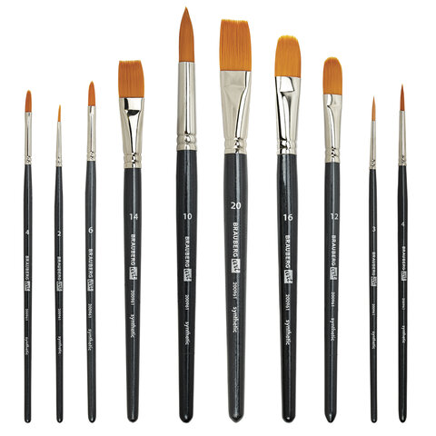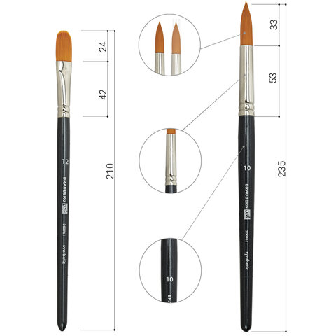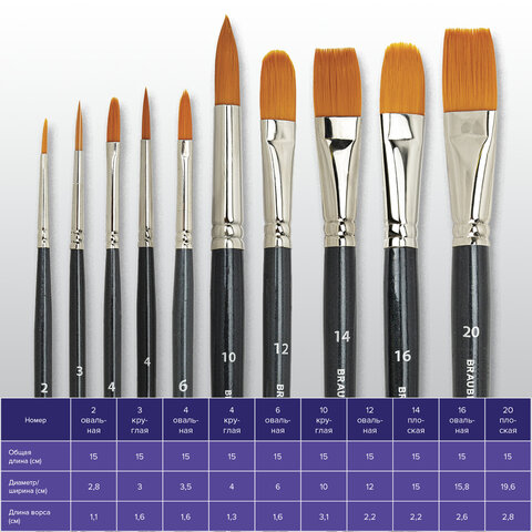 Кисти изготовлены с применением синтетики. Отличаются универсальностью в использовании, обусловленной упругостью ворса и прекрасными впитывающими свойствами пучка. Короткая ручка из древесины покрыта лаком, что защищает ее от воздействия красок и влаги. Форма пучка - овальная № 2, 4, 6, 12, 16; круглая № 3, 4, 10; плоская № 14, 20. Номер кисти соответствует реальной ширине пучка в миллиметрах. Упаковка - ПВХ с европодвесом и картонной подложкой.