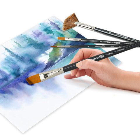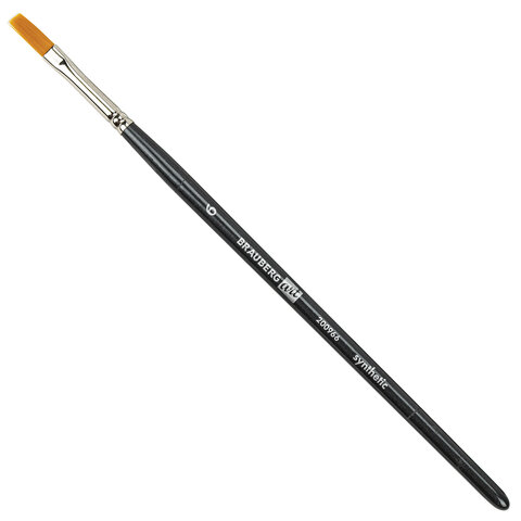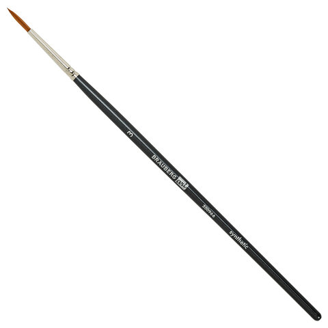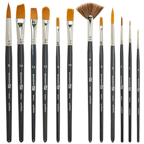Кисти изготовлены с применением синтетики. Отличаются универсальностью в использовании, обусловленной упругостью ворса и прекрасными впитывающими свойствами пучка. Короткая ручка из древесины покрыта лаком, что защищает ее от воздействия красок и влаги. Форма пучка - круглая № 0, 1, 3, 5, 8; плоская № 6, 10, 12; скошенная № 14; овальная № 6, 12; веерная № 8. Номер кисти соответствует реальной ширине пучка в миллиметрах. Упаковка - текстильный пенал в ОПП-пакете.