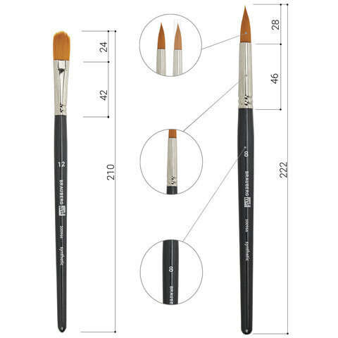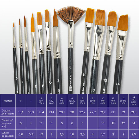 | Номер кисти | круглая № 0, 1, 3, 5, 8; плоская № 6, 10, 12; скошенная № 14; овальная № 6, 12; веерная № 8 |