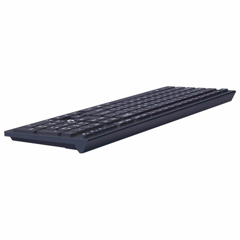 Клавиатура оснащена классическим набором из 108 клавиш с полноразмерными "BackSpace", "Enter" и "Пробел". Питание набора обеспечивается элементом питания типа AА (в комплект не входит). Радиус действия - 10 м. Цвет - черный. Вес - 370 г. Размер - 22х134х422 мм.