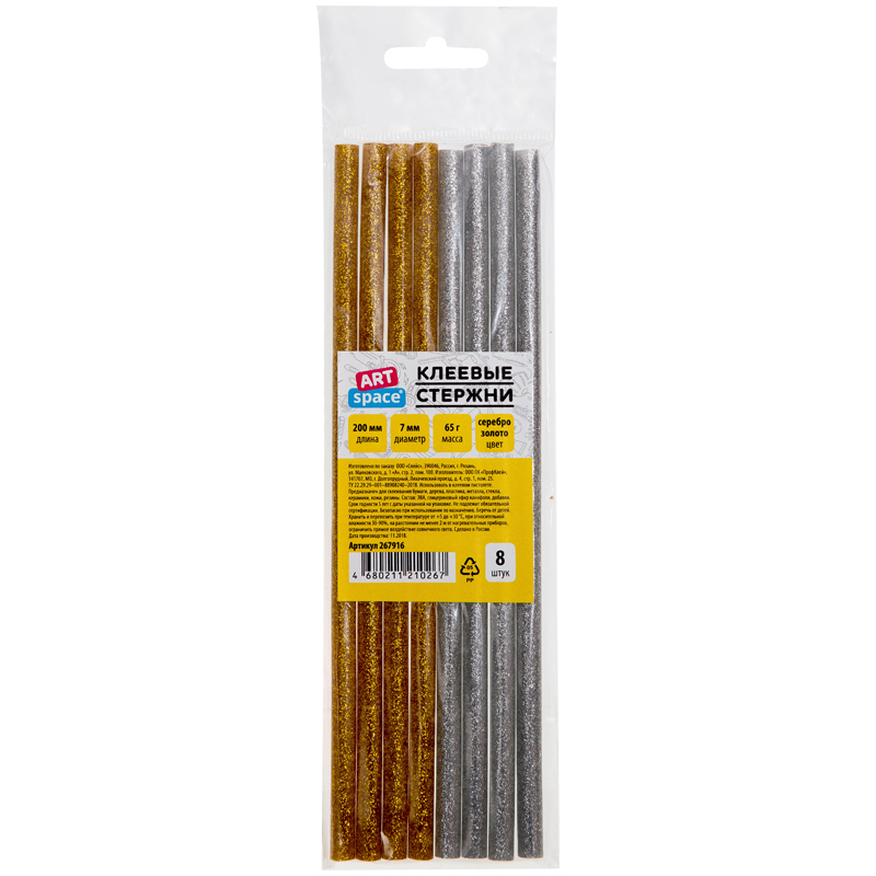 Клеевые стержни ArtSpace, диаметр 7мм, длина 200мм, набор 8шт. (золото, серебро), европодвес
