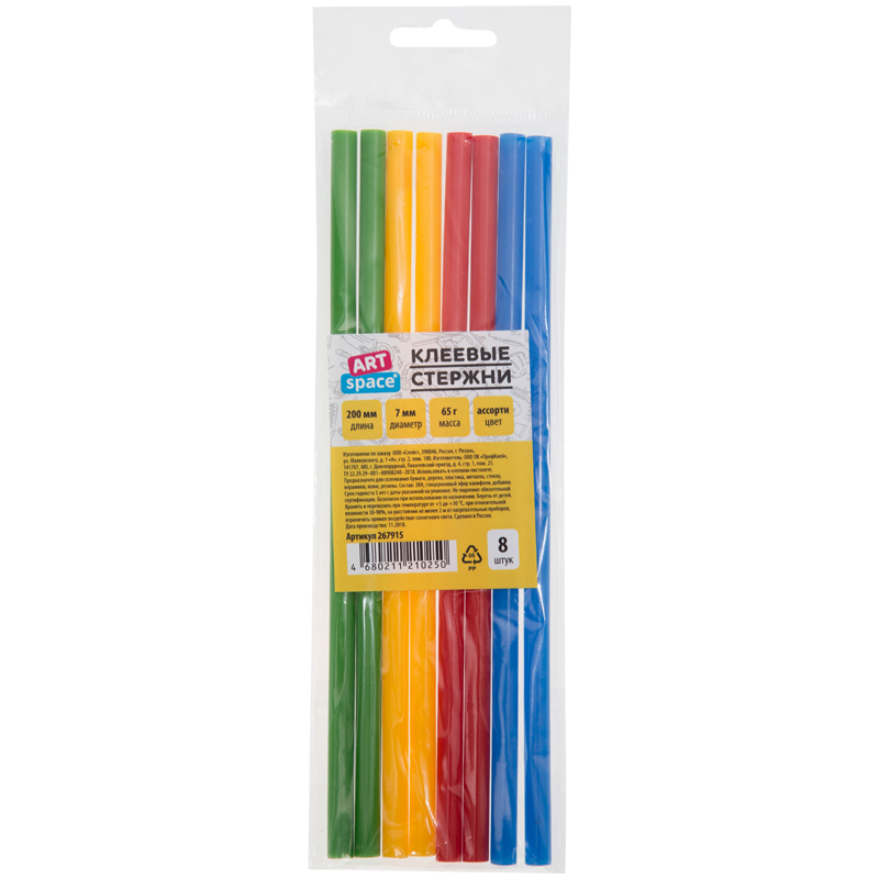 Клеевые стержни ArtSpace, диаметр 7мм, длина 200мм, цветные, набор 8шт., европодвес