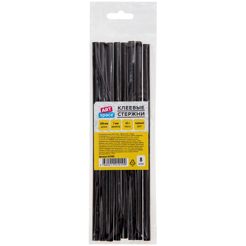Клеевые стержни ArtSpace, диаметр 7мм, длина 200мм, черные, набор 8шт., европодвес