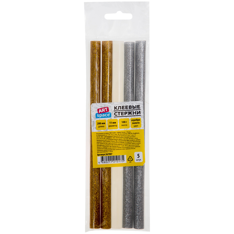 Клеевые стержни ArtSpace, диаметр 11мм, длина 200мм, золото/серебро/прозр., набор 5шт., европодвес