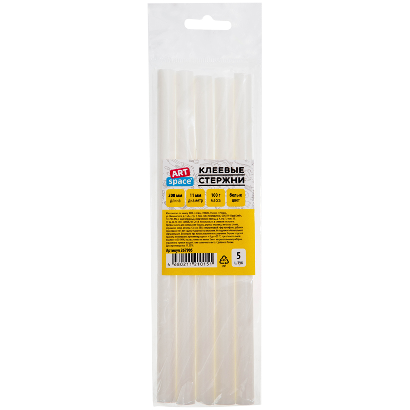 Клеевые стержни ArtSpace, диаметр 11мм, длина 200мм, белые, набор 5шт., европодвес