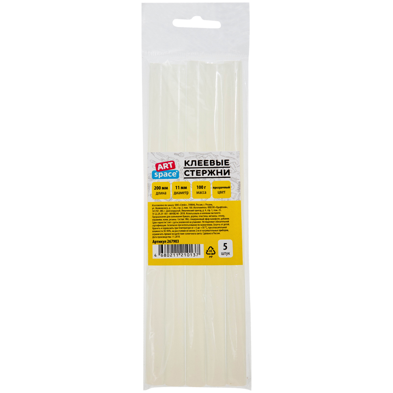 Клеевые стержни ArtSpace, диаметр 11мм, длина 200мм, прозрачные, набор 5шт., европодвес