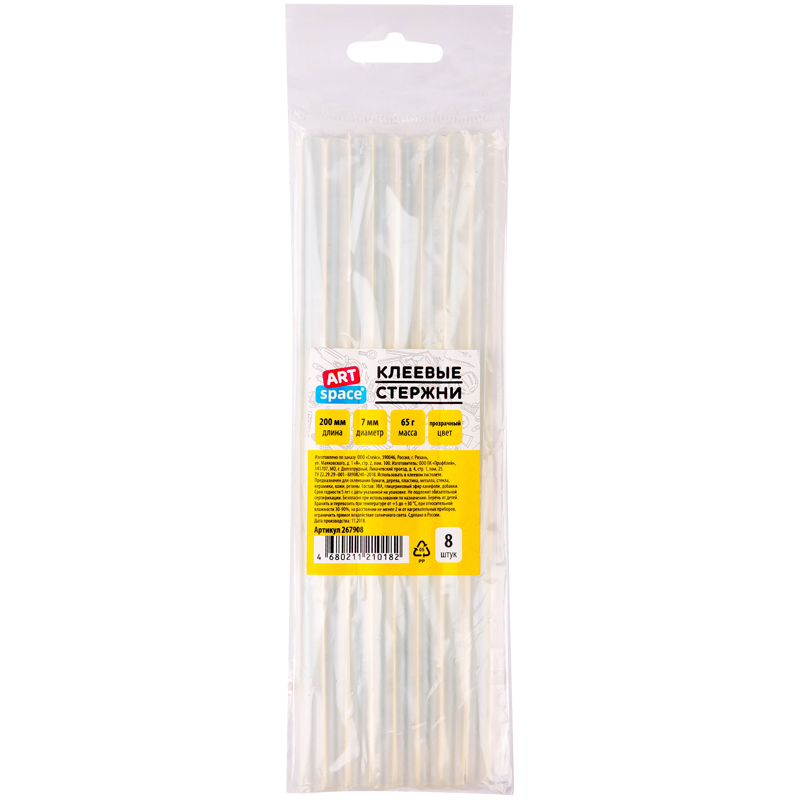 Клеевые стержни ArtSpace, диаметр 7мм, длина 200мм, прозрачные, набор 8шт., европодвес