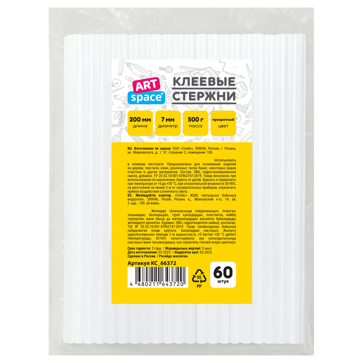 Клеевые стержни ArtSpace, диаметр 7мм, длина 200мм, прозрачные, набор 60шт., пакет